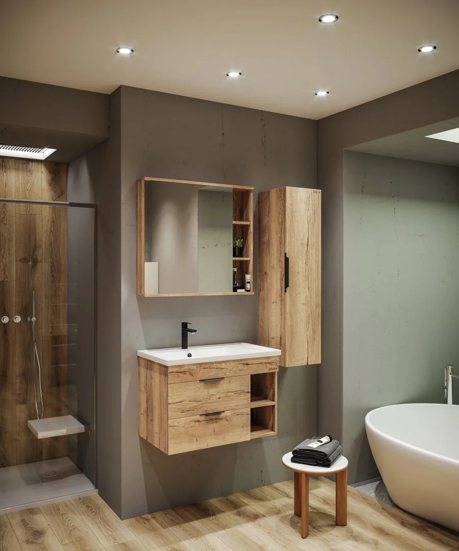 Тумба выполнена из влагостойкого ЛДСП, устойчивой к перепадам температур и высокой влажности, крепится к стене.