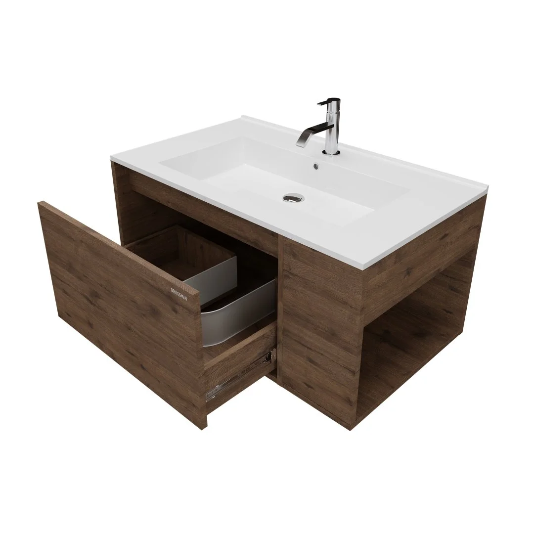 Тумба выполнена из влагостойкого ЛДСП, устойчивая к перепадам температур и высокой влажности, крепится к стене и не занимает место на полу.
