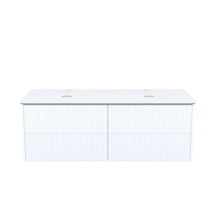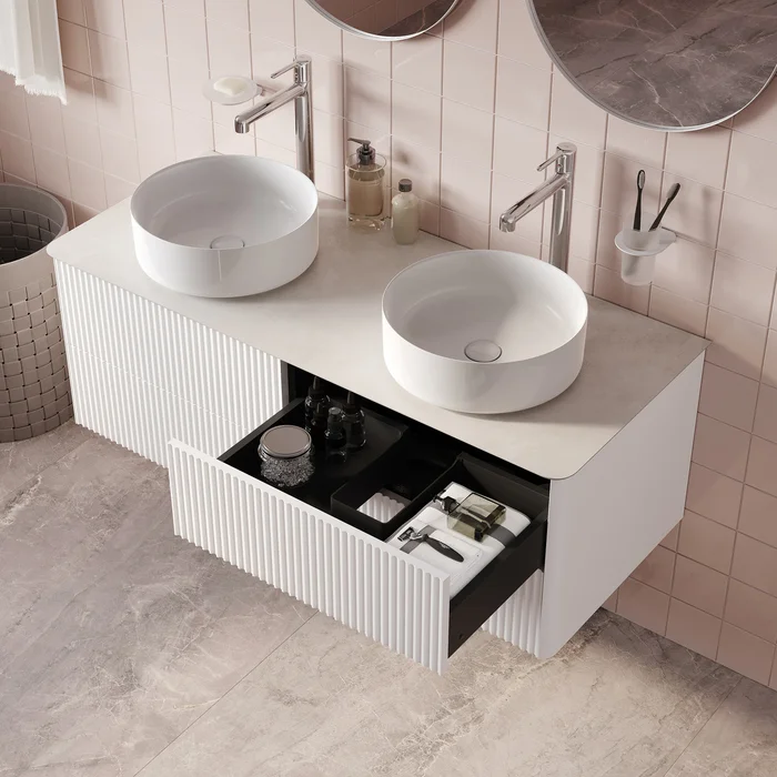 Большая подвесная тумба для ванной комнаты Aiger в классическом белом цвете с выдвижными ящиками и столешницей из керамогранита – красивый лаконичный дизайн вне времени с трендовой вертикальной фрезеровкой.