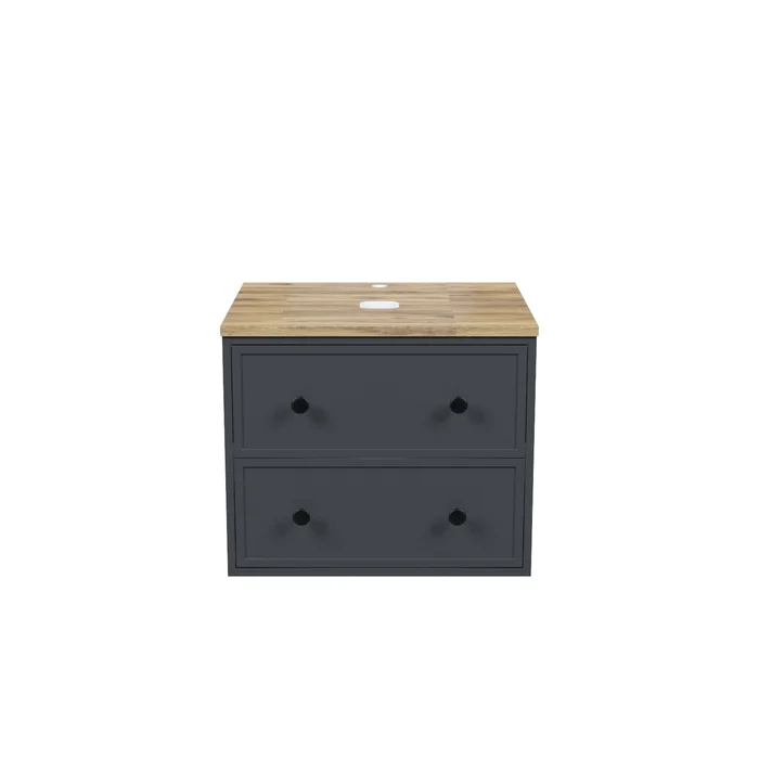 Компактная подвесная тумба Torr трендового темно-серого цвета со столешницей из клееного натурального дуба. Сочетает в себе узнаваемый стиль и практичность популярного скандинавского дизайна. Ее четкие формы, теплый цвет дерева, фасады с декоративной филенкой, круглые ручки смотрятся гармонично и впишутся в любой современный интерьер. Подойдет любой накладной умывальник, покупается отдельно.