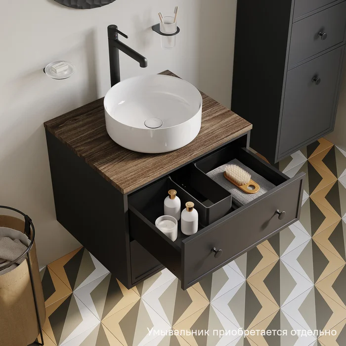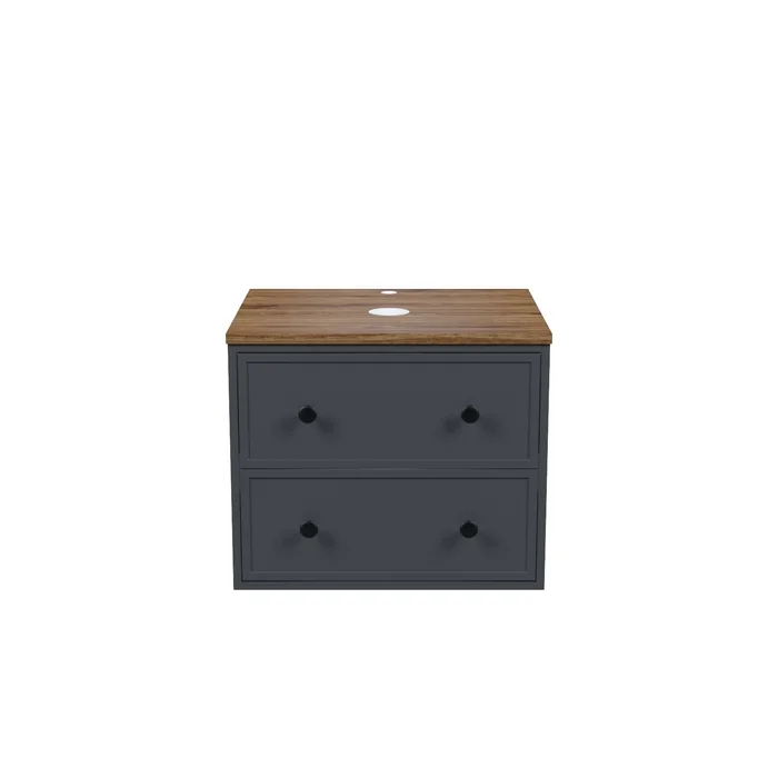 Компактная подвесная тумба Torr трендового темно-серого цвета со столешницей из МДФ в оттенке ореха макадамия. Сочетает в себе узнаваемый стиль и практичность популярного скандинавского дизайна. Ее четкие формы, теплый цвет дерева, фасады с декоративной филенкой, круглые ручки смотрятся гармонично и впишутся в любой современный интерьер. Подойдет любой накладной умывальник, покупается отдельно.