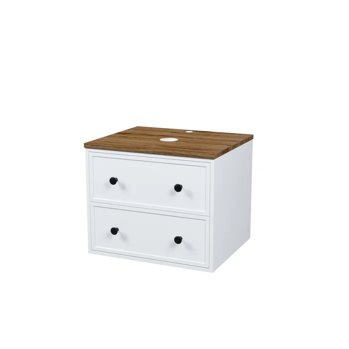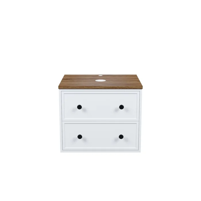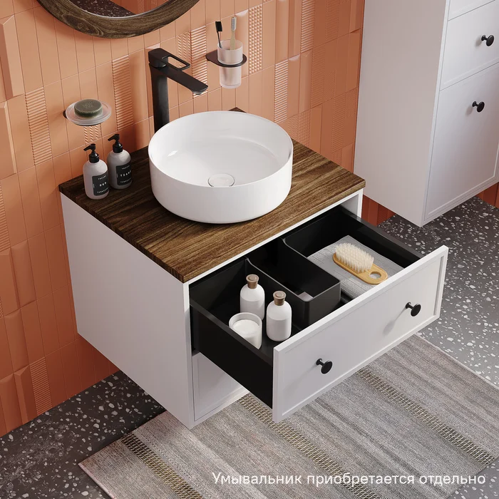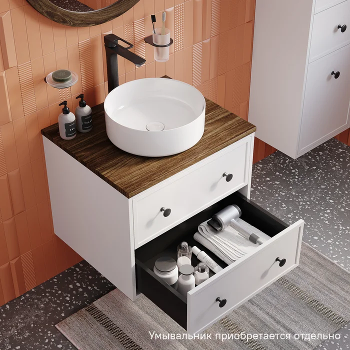 Компактная подвесная тумба Torr классического молочно-белого цвета со столешницей из МДФ в оттенке ореха макадамия. Сочетает в себе узнаваемый стиль и практичность популярного скандинавского дизайна. Ее четкие формы, теплый цвет дерева, фасады с декоративной филенкой, круглые ручки смотрятся гармонично и впишутся в любой современный интерьер. Подойдет любой накладной умывальник, покупается отдельно.