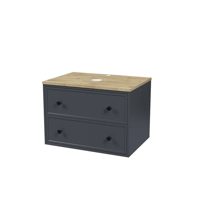 Компактная подвесная тумба Torr трендового темно-серого цвета со столешницей из МДФ в оттенке дуба верона. Сочетает в себе узнаваемый стиль и практичность популярного скандинавского дизайна. Ее четкие формы, теплый цвет дерева, фасады с декоративной филенкой, круглые ручки смотрятся гармонично и впишутся в любой современный интерьер. Подойдет любой накладной умывальник, покупается отдельно.