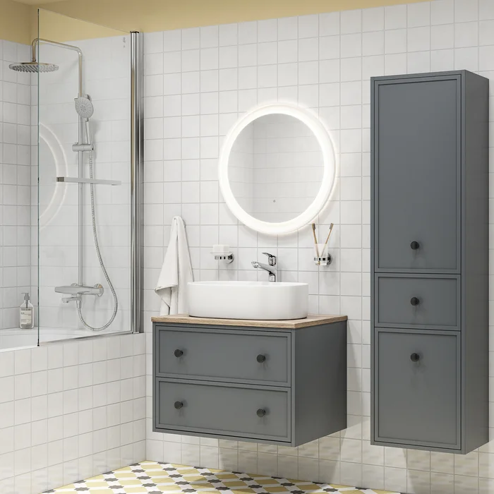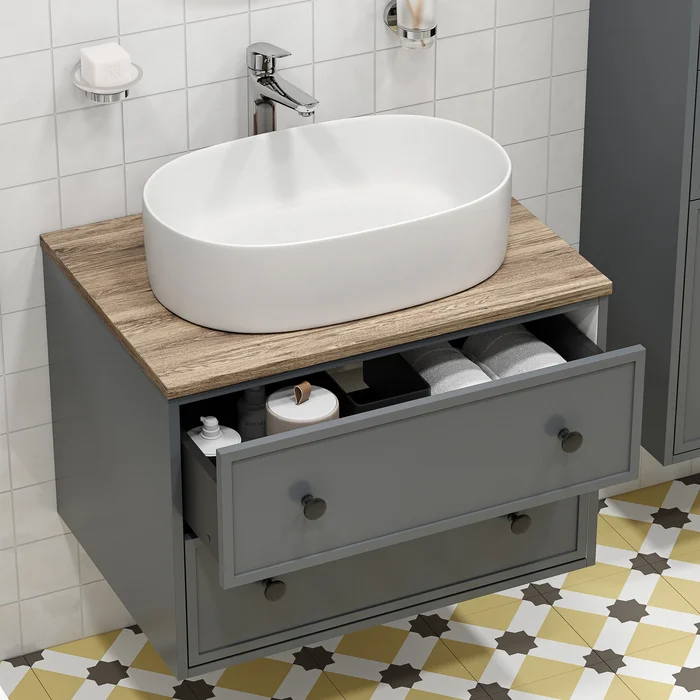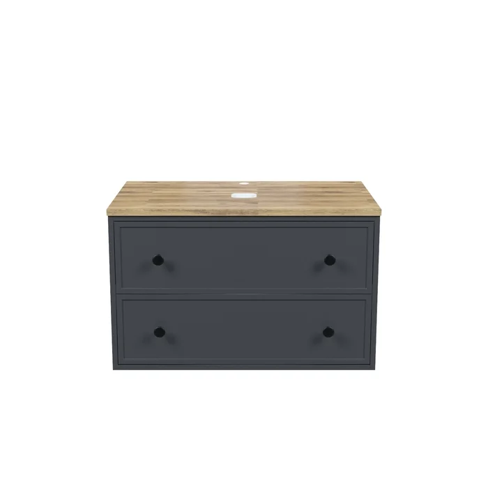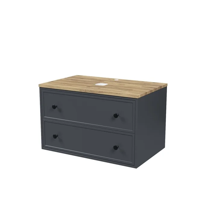 Вместительная подвесная тумба Torr трендового темно-серого цвета со столешницей из клееного натурального дуба. Сочетает в себе узнаваемый стиль и практичность популярного скандинавского дизайна. Ее четкие формы, теплый цвет дерева, фасады с декоративной филенкой, круглые ручки смотрятся гармонично и впишутся в любой современный интерьер. Подойдет любой накладной умывальник, покупается отдельно.
