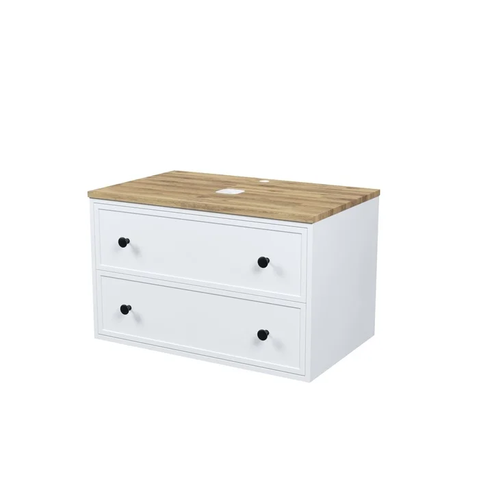 Вместительная подвесная тумба Torr классического молочно-белого цвета со столешницей из клееного натурального дуба. Сочетает в себе узнаваемый стиль и практичность популярного скандинавского дизайна. Ее четкие формы, теплый цвет дерева, фасады с декоративной филенкой, круглые ручки смотрятся гармонично и впишутся в любой современный интерьер. Подойдет любой накладной умывальник, покупается отдельно.