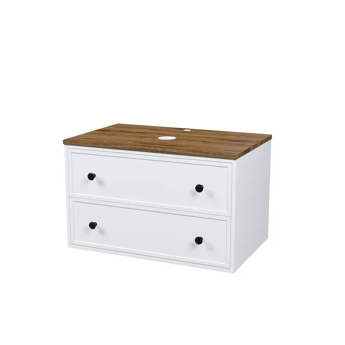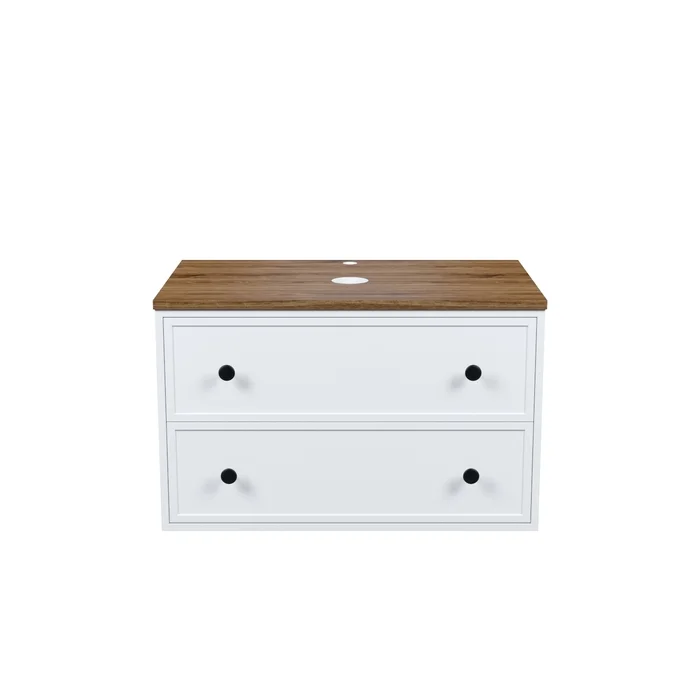 Вместительная подвесная тумба Torr классического молочно-белого цвета со столешницей из МДФ в оттенке ореха макадамия. Сочетает в себе узнаваемый стиль и практичность популярного скандинавского дизайна. Ее четкие формы, теплый цвет столешницы, фасады с декоративной филенкой, круглые ручки смотрятся гармонично и впишутся в любой современный интерьер. Подойдет любой накладной умывальник, покупается отдельно.