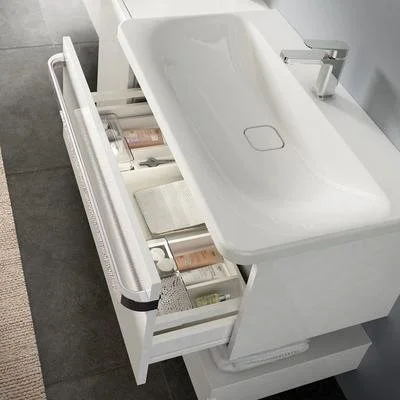 TONIC II Подстолье для умывальника 80 см, для подвесного монтажа, с 1-м ящиком, система плавного закрытия. В комплекте: крепеж, сифон New Space IdealFlow - 1 шт., светодиодная подсветка - 1 шт. внутри ящика, с сенсором на открытие, без подключения к сети, с батарейкой, подзарядка от USB. Ручка в комплект не включена. Для монтажа с умывальником Tonic II 80 см K0839 (с отверстием под смеситель) или с симметричной чашей Tonic II 55 см K0834 со стеклянной белой столешницей R4331SA и настенным смесителем или с асимметричной чашей Tonic II 55 см K0833 со стеклянной белой столешницей R4335SA с отверстием под смеситель с удлиненным корпусом. Внимание: столешница заказывается дополнительно!