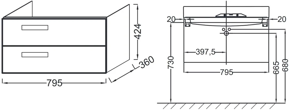 2 выдвижных ящика с механизмом «плавное закрывание» и 4 ящичка для хранения