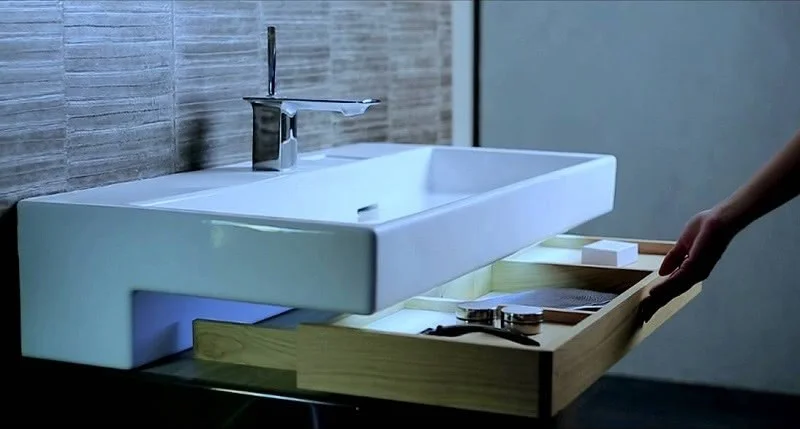 Имеет 1 выдвижной ящик для аксессуаров из цельного дерева и 1 выдвижной ящик с механизмом «плавное закрывание».