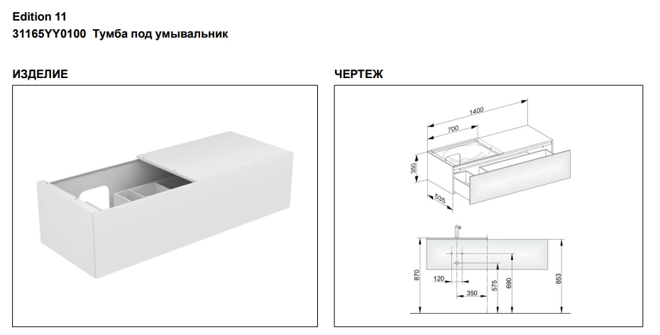 Тумба под раковину Keuco Edition 11 31165YY0100, 1400х350х535 мм