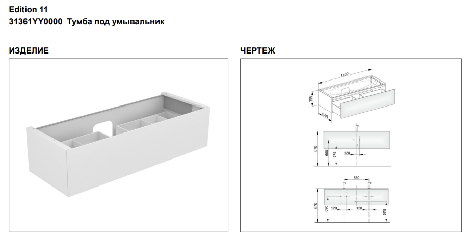 Тумба под раковину Keuco Edition 11 31361YY0000, 1400х350х535 мм