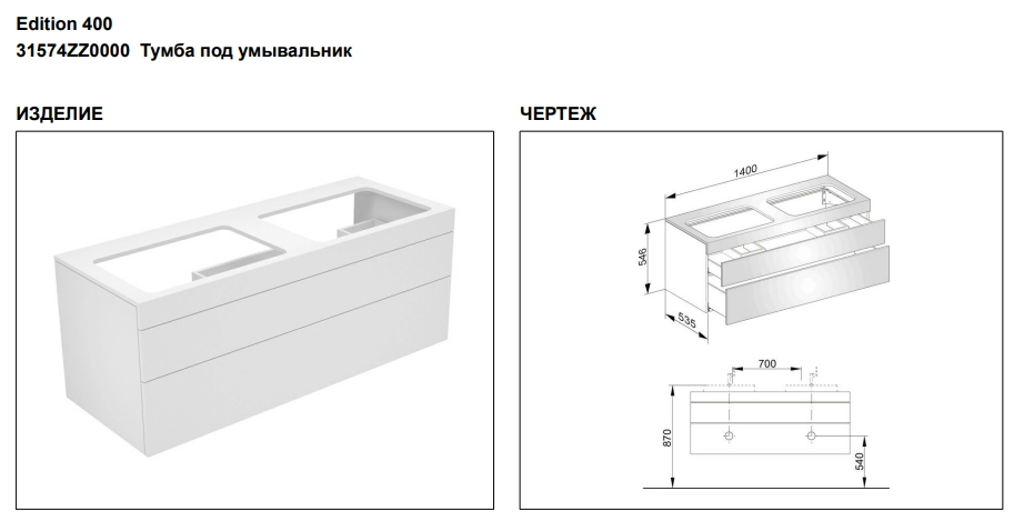 Тумба под раковину Keuco Edition 400 31574ZZ0000, 1400х546х535 мм