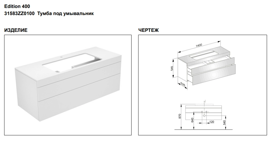 Тумба под раковину Keuco Edition 400 31583ZZ0100, 1400х546х535 мм