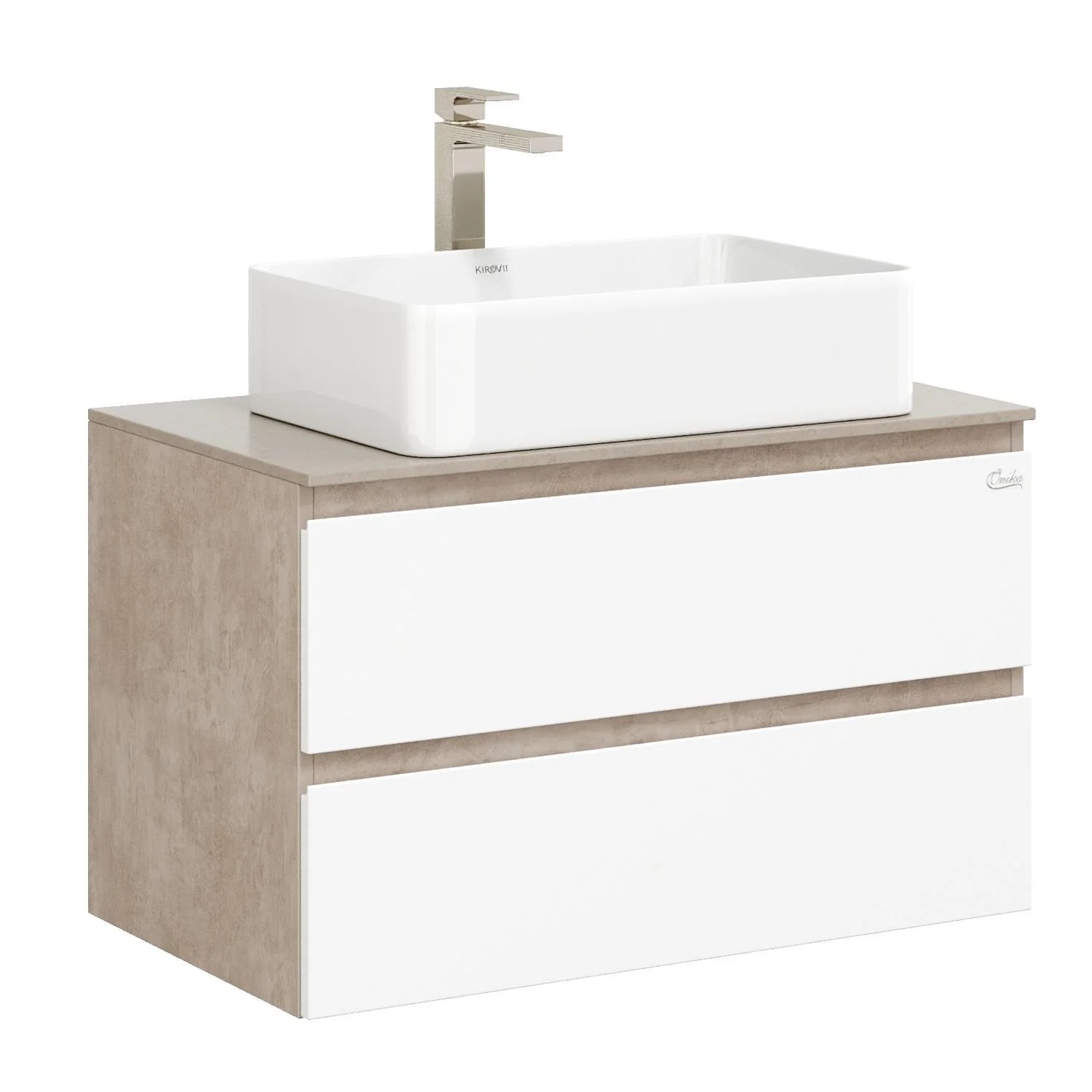 Подвесная тумба Onika Алеста 80 отражает актуальные тенденции в дизайне мебели для ванной комнаты: минимализм и геометрия фасадов, белый глянец и текстура бетонного камня, отсутствие декора, столешница из керамогранита и накладная раковина.