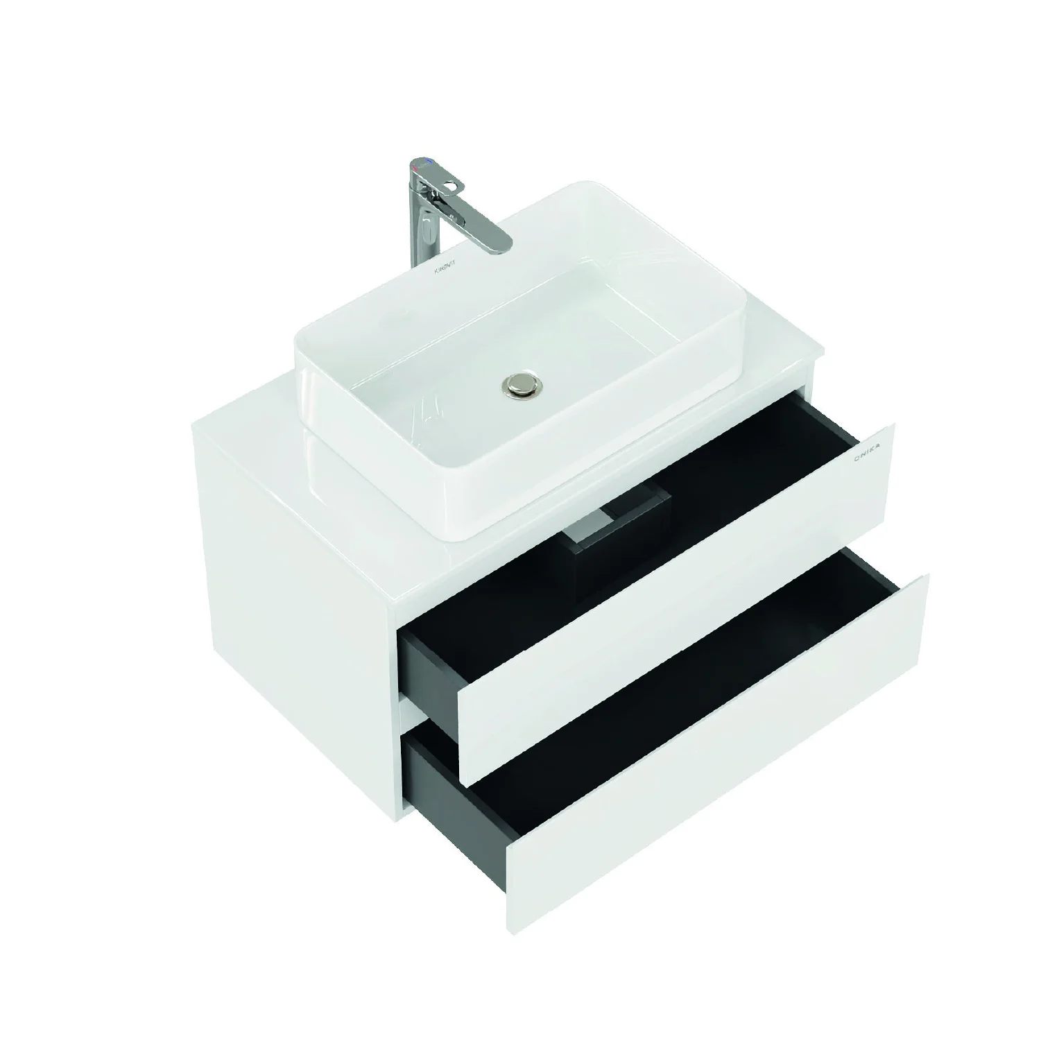 Два ящика с направляющими скрытого монтажа с доводчиками разделены на отсеки для удобной организации косметических средств и других аксессуаров.