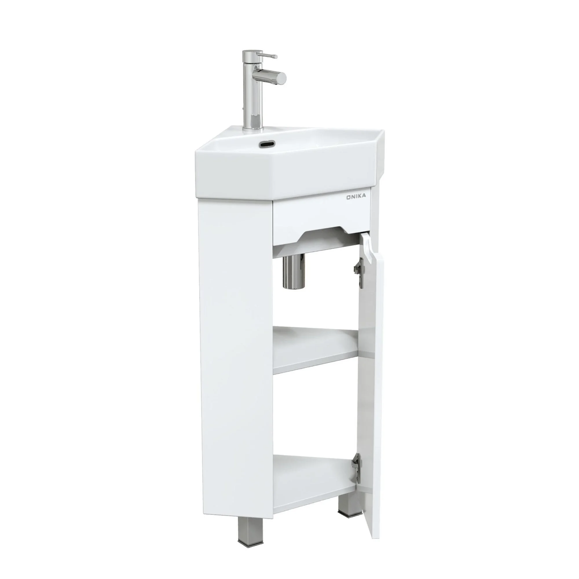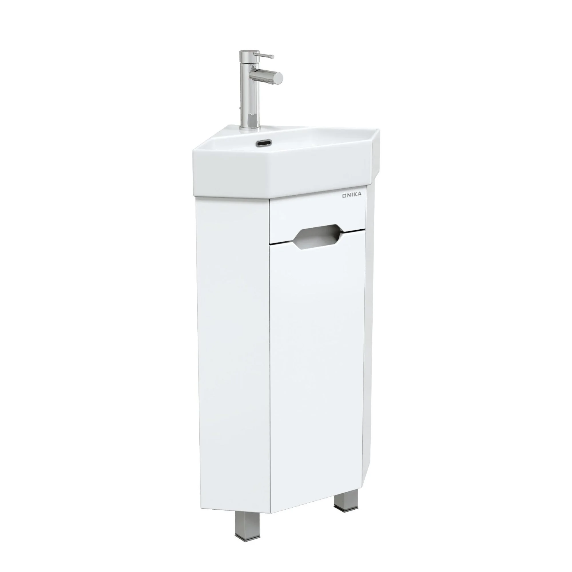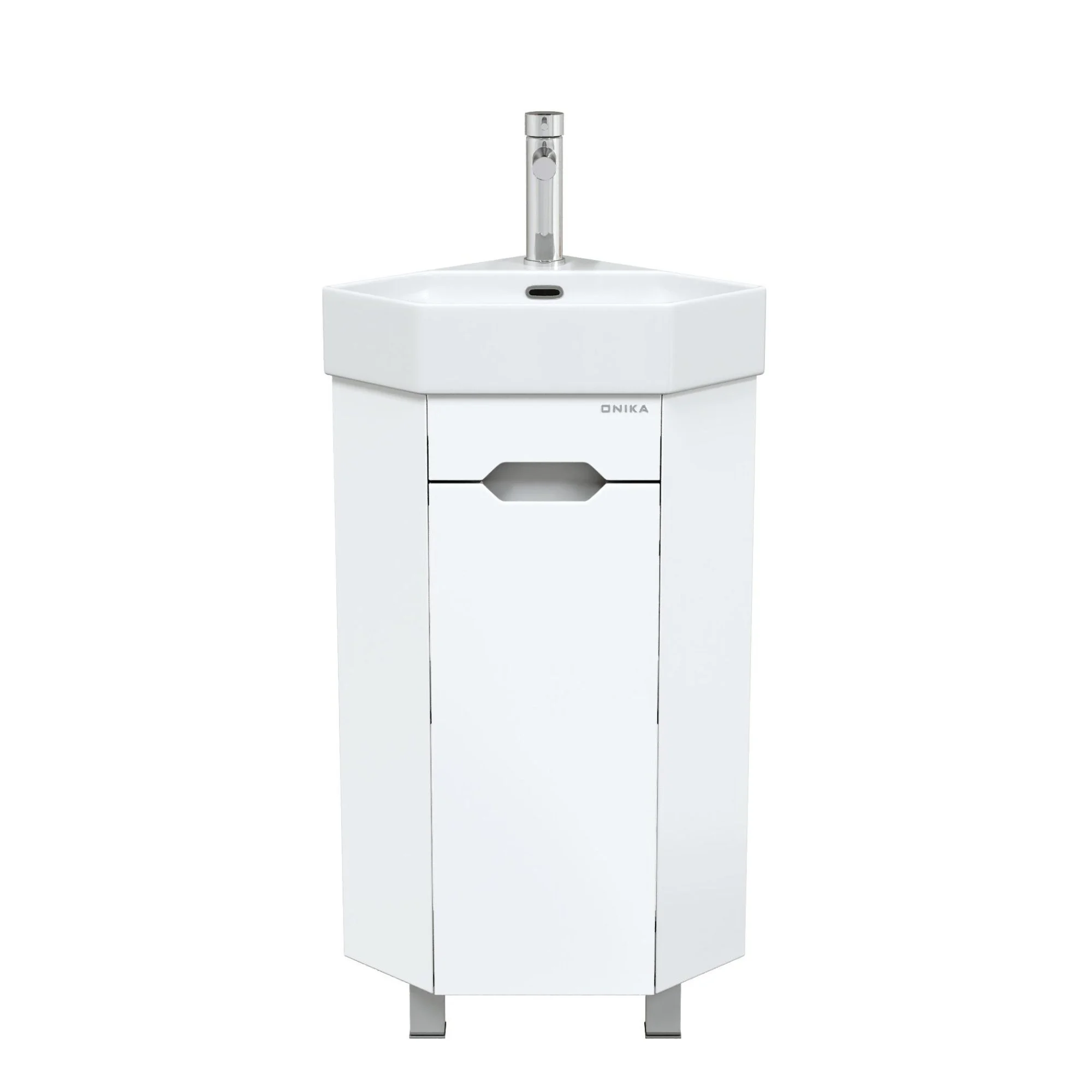 Угловая напольная тумба для ванной комнаты Onika Айленд 35 сочетает в себе стильный минималистичный дизайн, белую глянцевую поверхность и высочайшее качество исполнения.