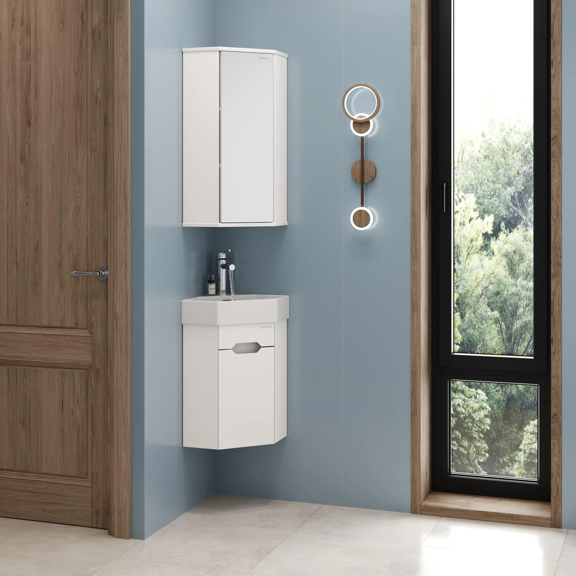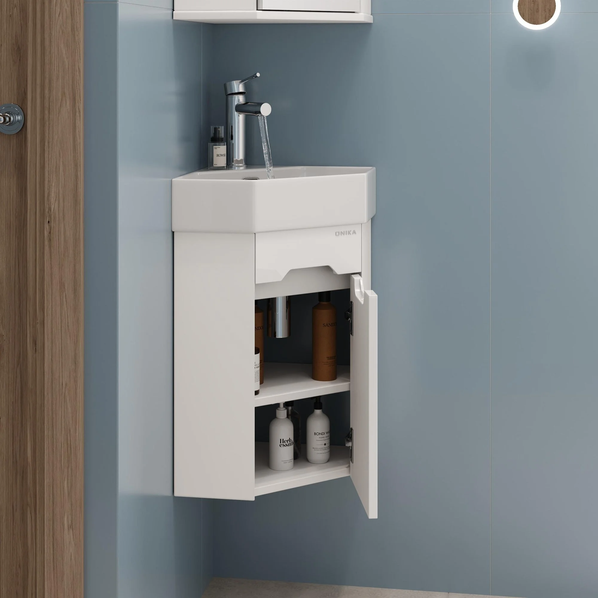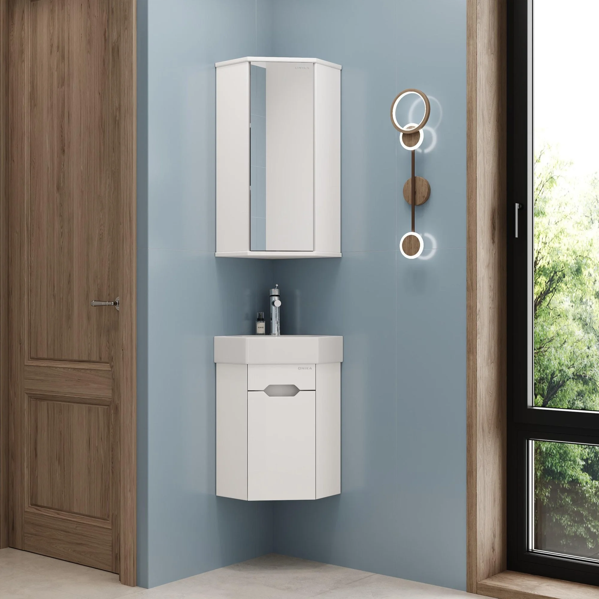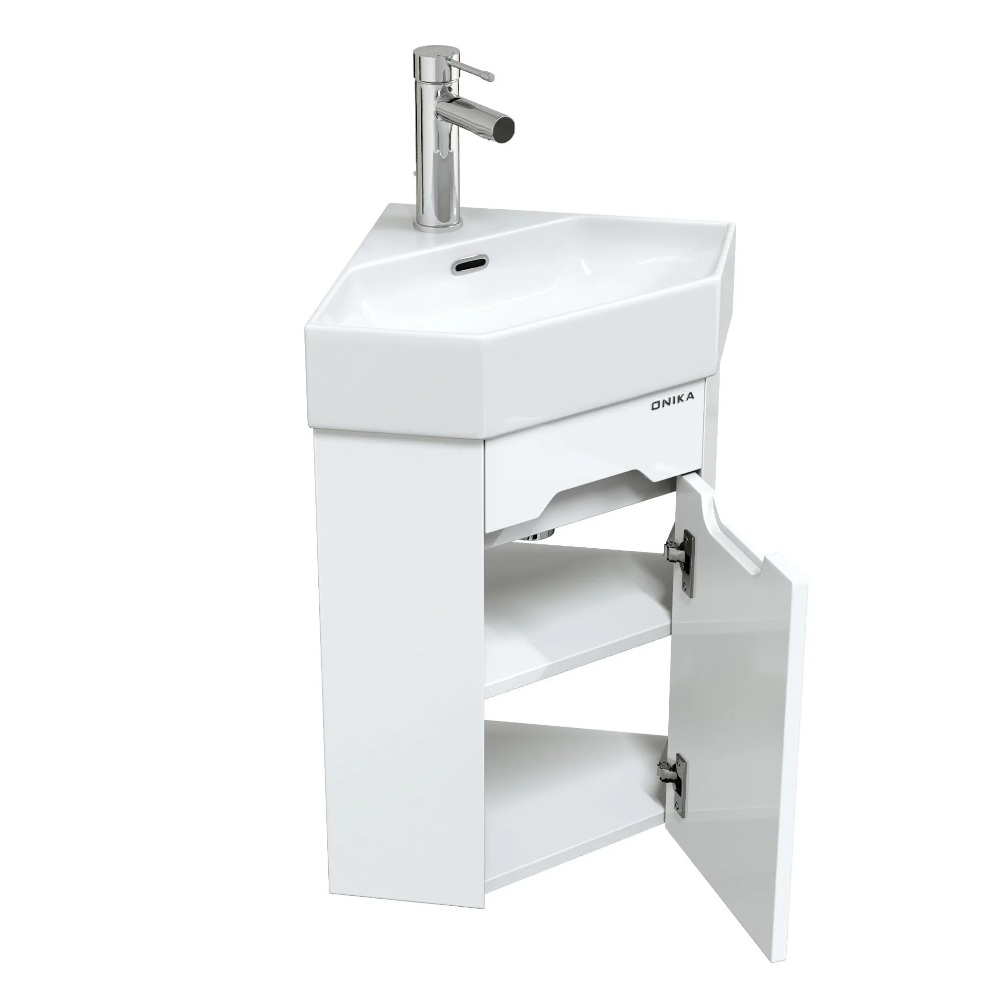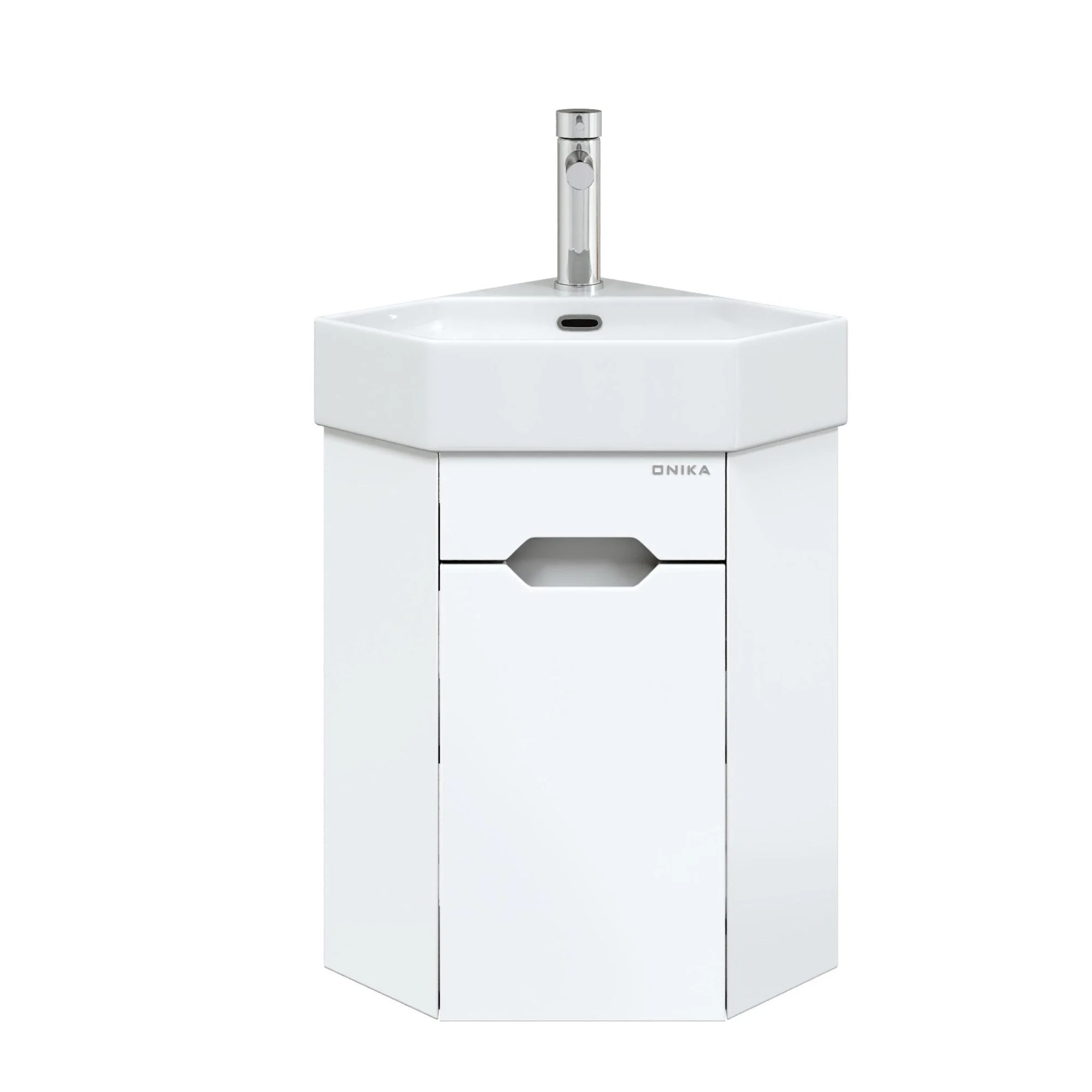 Подвесная угловая тумба для ванной комнаты Onika Айленд 35 сочетает в себе стильный минималистичный дизайн, белую глянцевую поверхность и высочайшее качество исполнения.