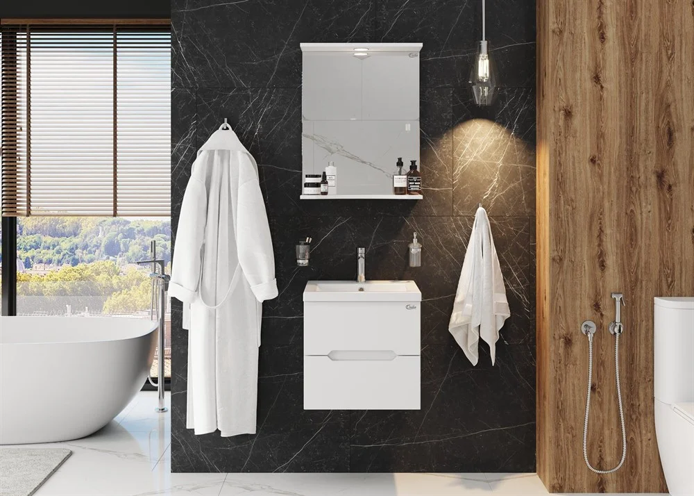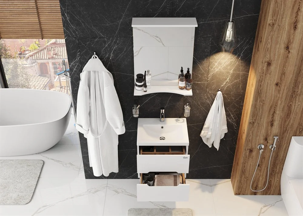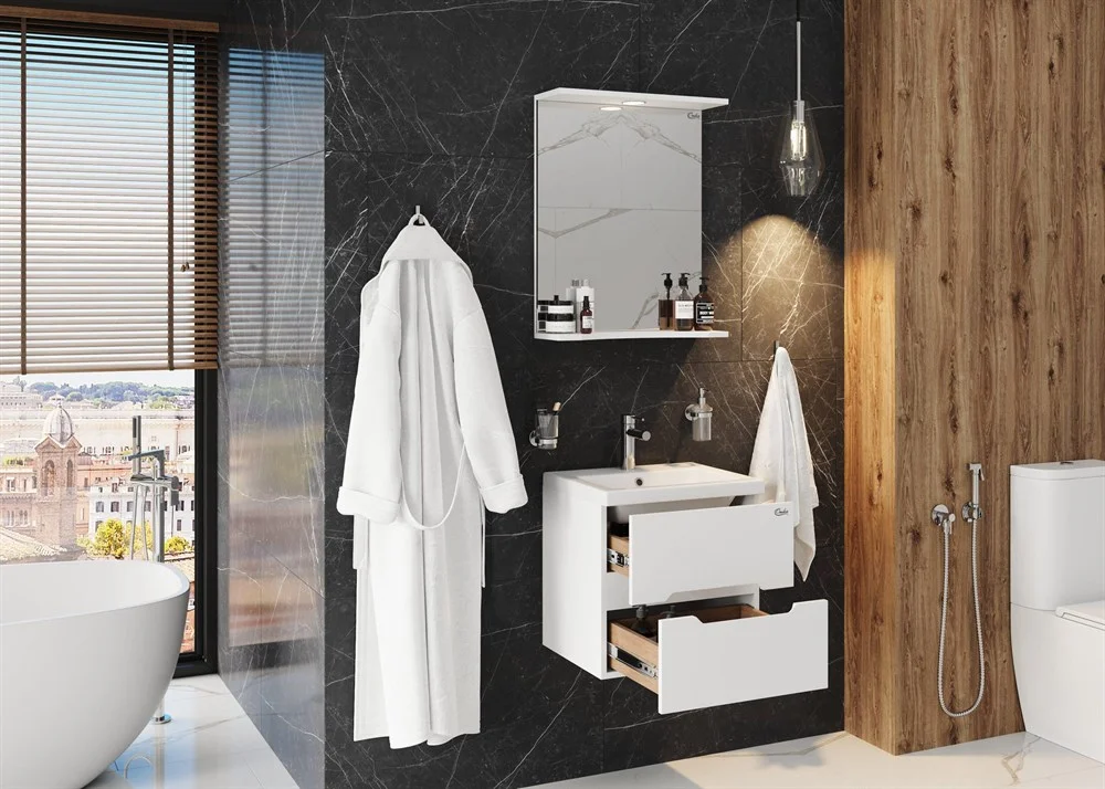 Корпус тумбы выполнен из ЛДСП, фасады ящиков - из МДФ в пленке, устойчивых к механическим воздействиям, перепадам температур и высокой влажности, при этом тумба надежно крепится к стене и не занимает место на полу, не создавая при этом сложностей в уборке помещения.