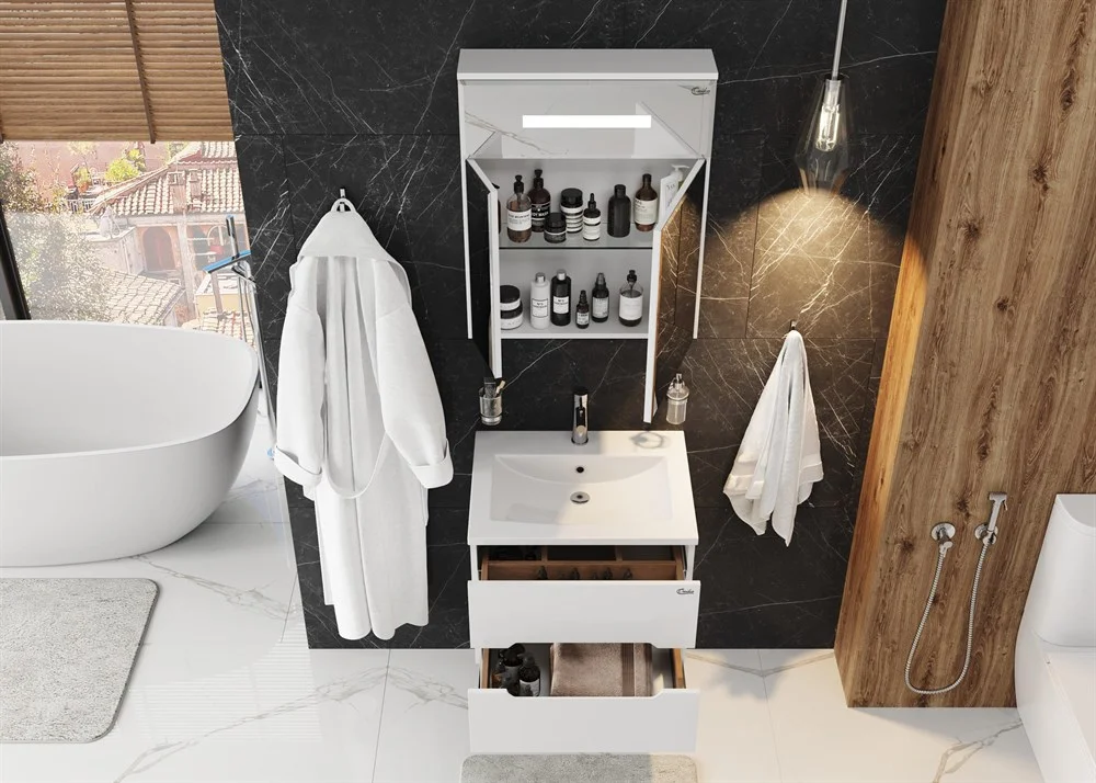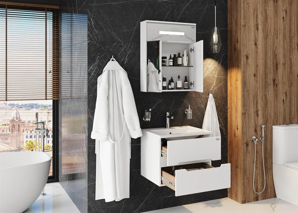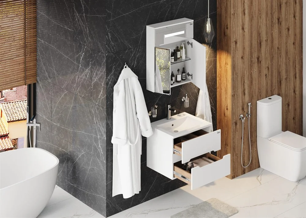 Корпус тумбы выполнен из ЛДСП, фасады ящиков - из МДФ в пленке, устойчивых к механическим воздействиям, перепадам температур и высокой влажности, при этом тумба надежно крепится к стене и не занимает место на полу, не создавая при этом сложностей в уборке помещения.