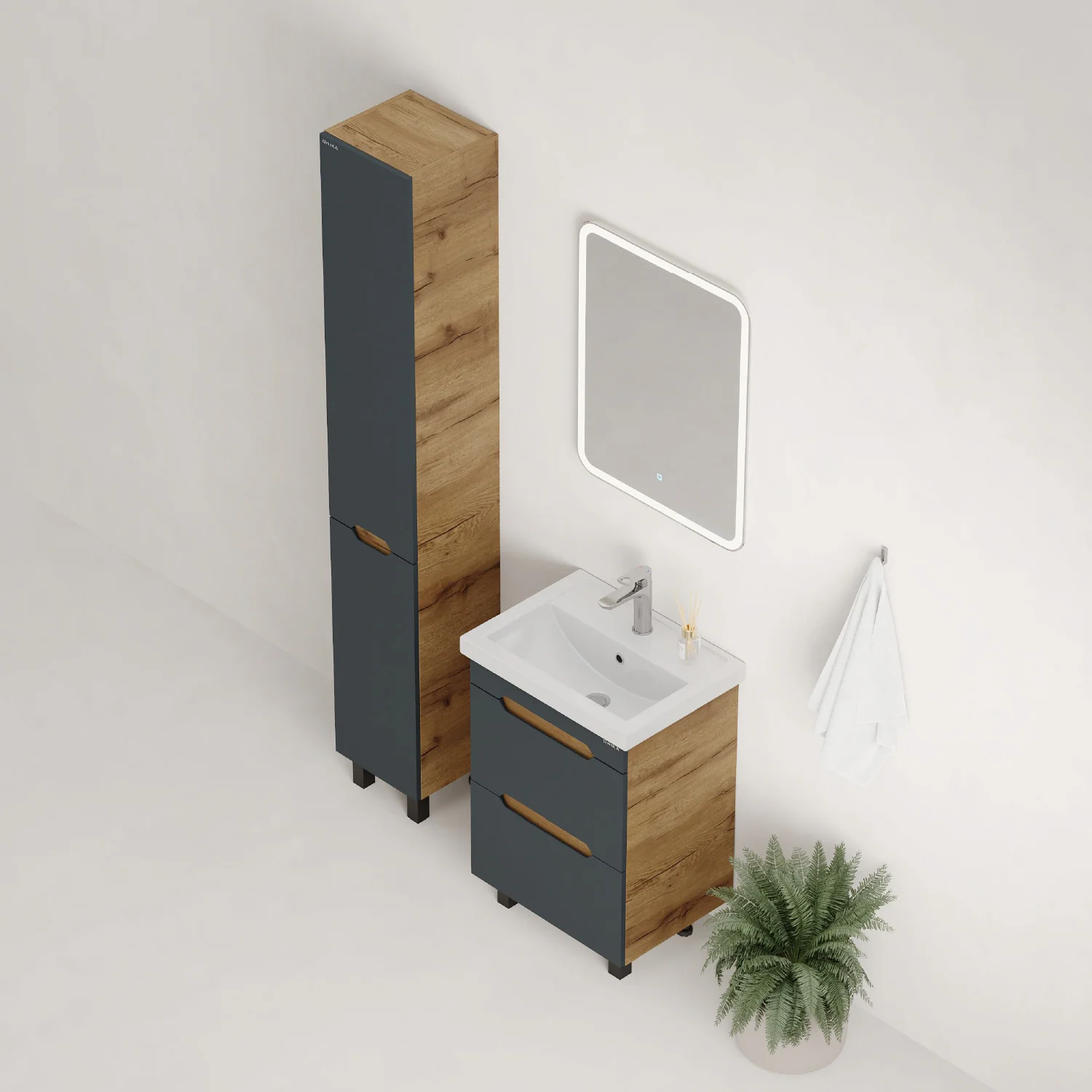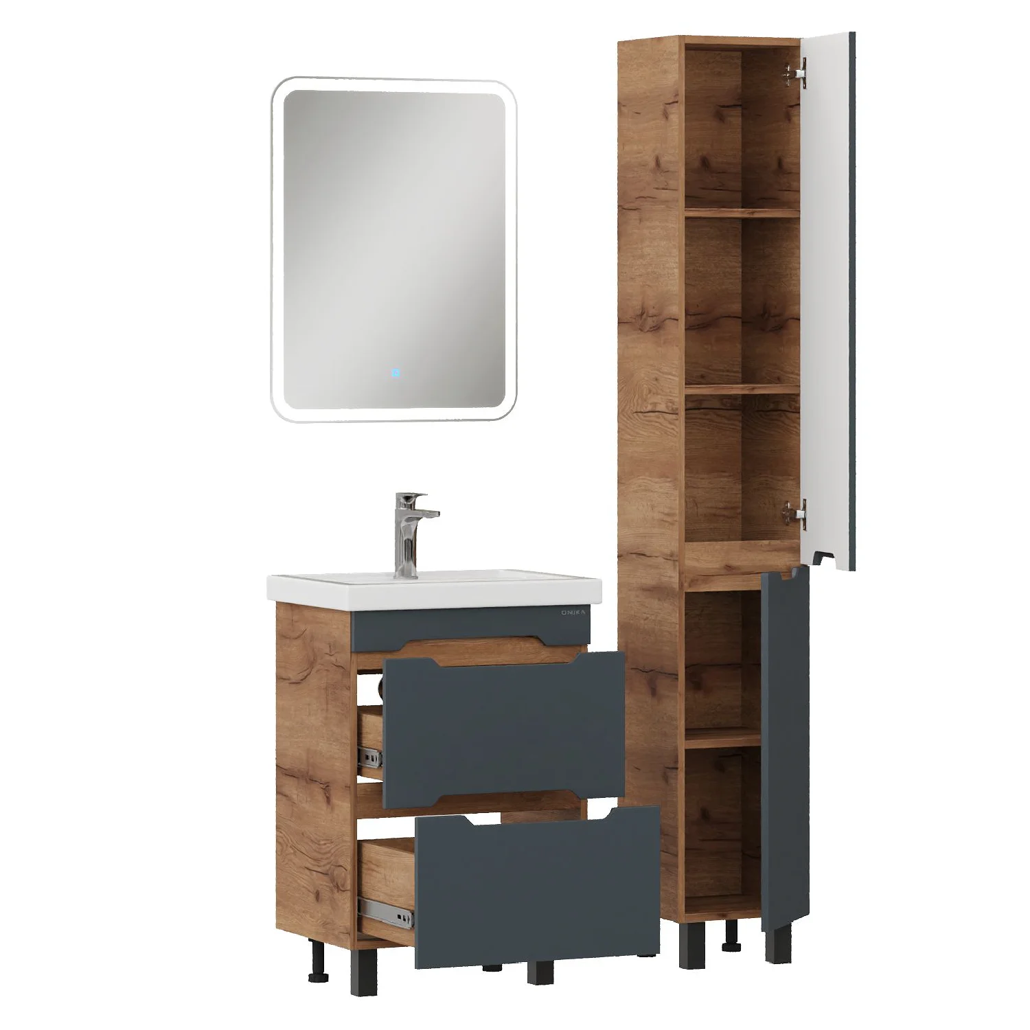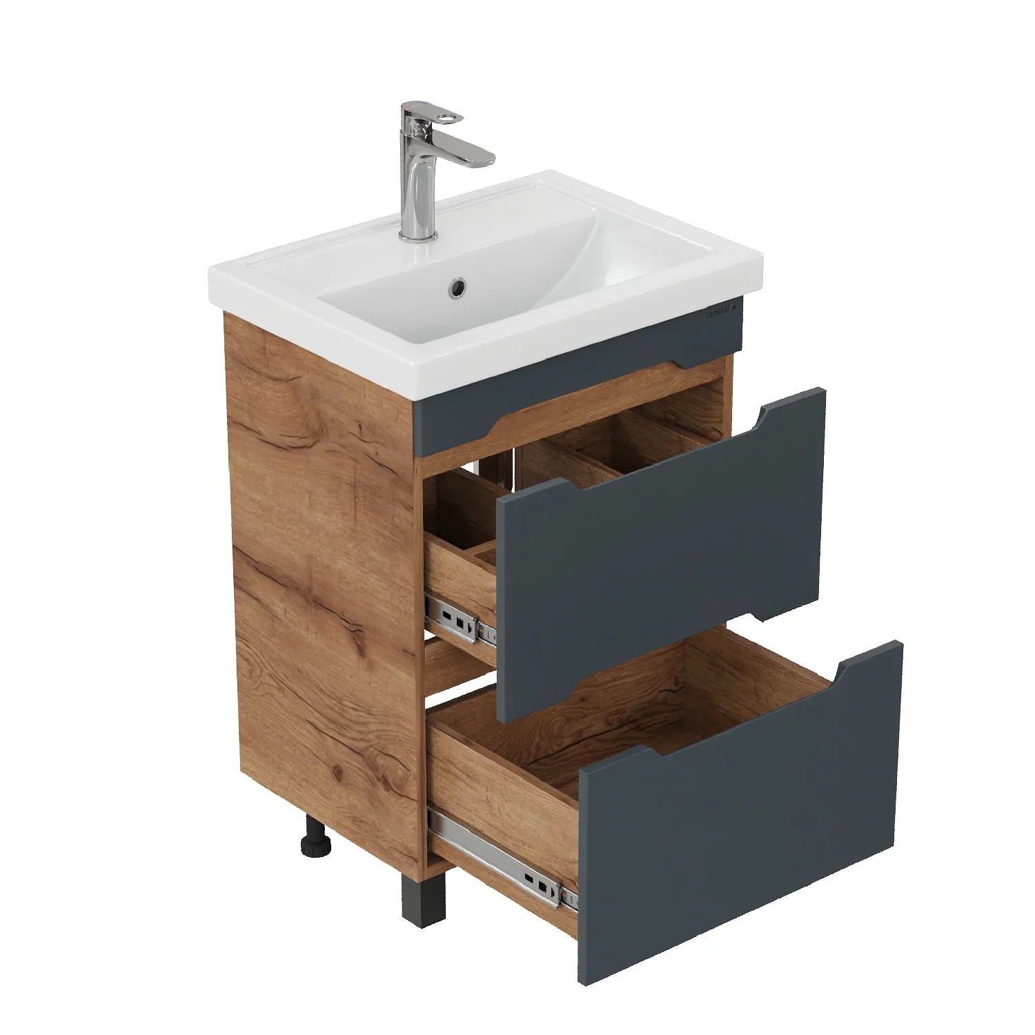 Тумба впишется в любой интерьер благодаря трендовому сочетанию матового графита и золотого дуба, а также поможет эффективно организовать пространство, что особенно важно в небольших ванных комнатах. В её конструкции предусмотрены два ящика, оснащенных направляющими полного выдвижения: нижний ящик подходит для хранения крупных предметов, а верхний, оборудованный практичной системой организации, вмещает мелкие аксессуары.