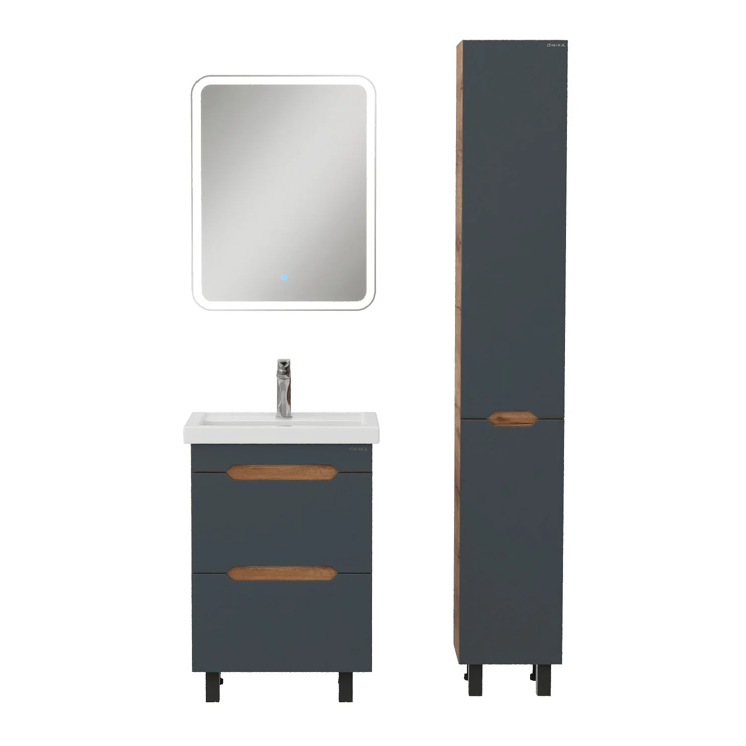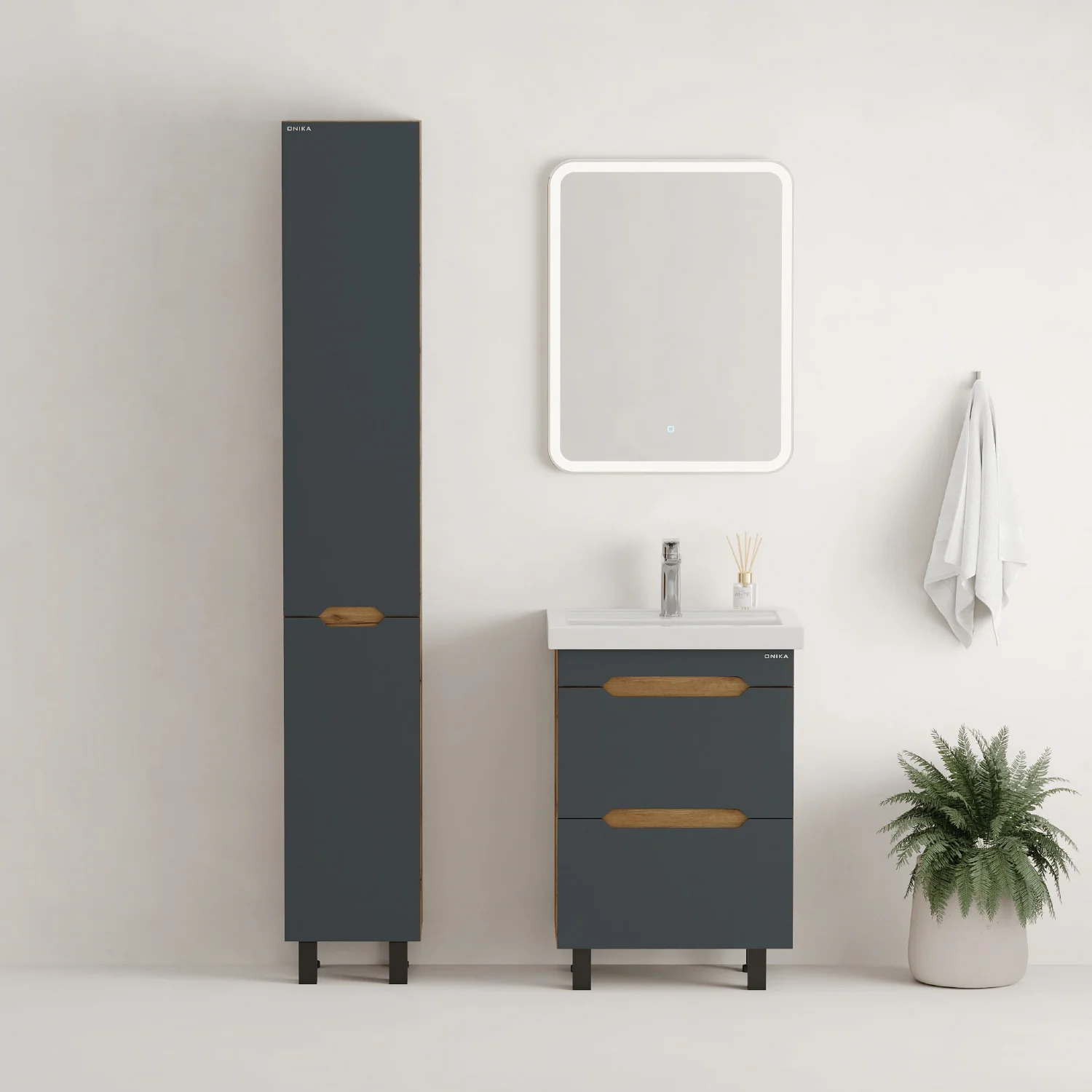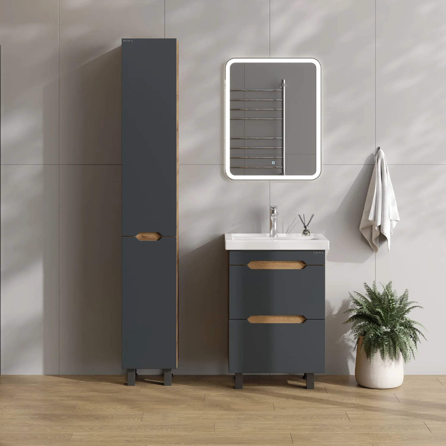 Тумба впишется в любой интерьер благодаря трендовому сочетанию матового графита и золотого дуба, а также поможет эффективно организовать пространство, что особенно важно в небольших ванных комнатах. В её конструкции предусмотрены два ящика, оснащенных направляющими полного выдвижения: нижний ящик подходит для хранения крупных предметов, а верхний, оборудованный практичной системой организации, вмещает мелкие аксессуары.