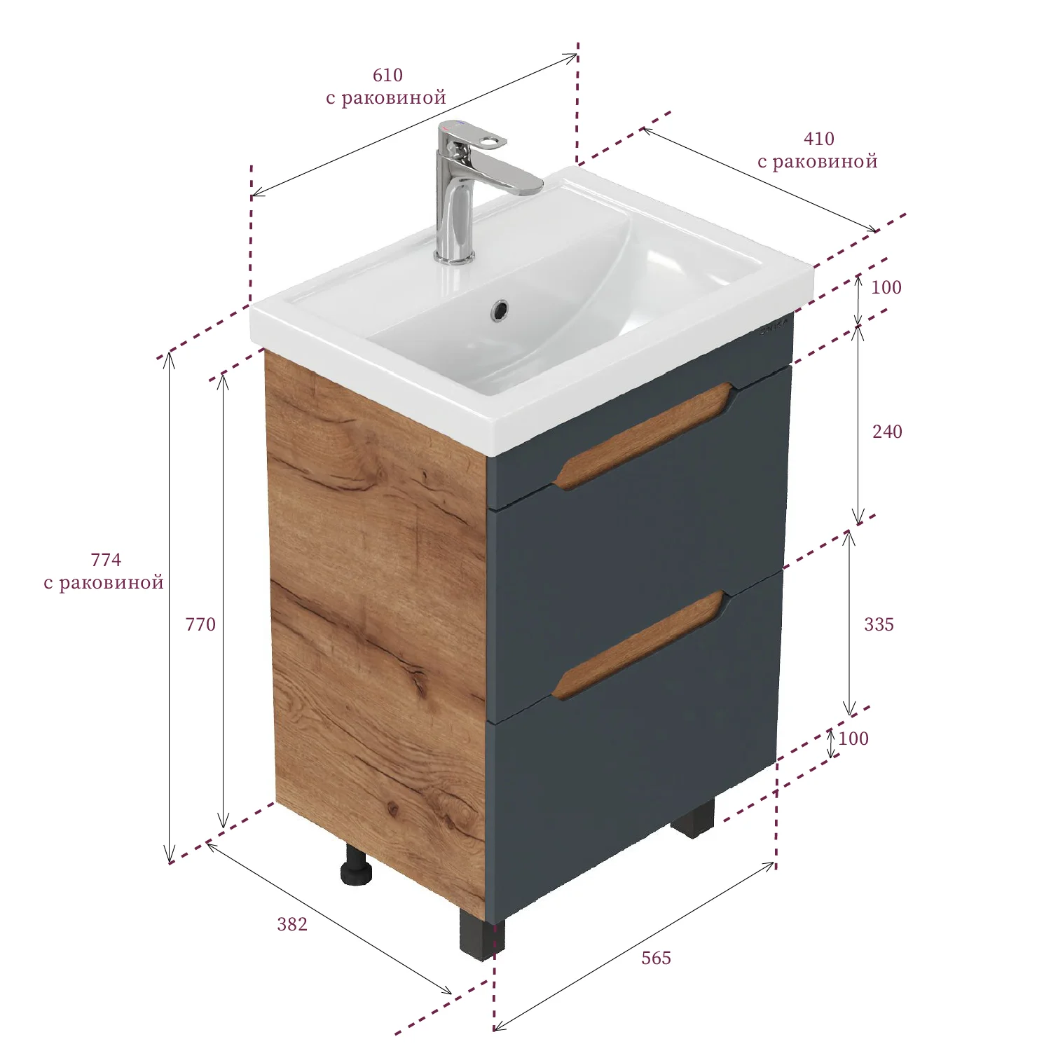 Размеры тумбы без учета раковины и ножек: 67х38х68 см.