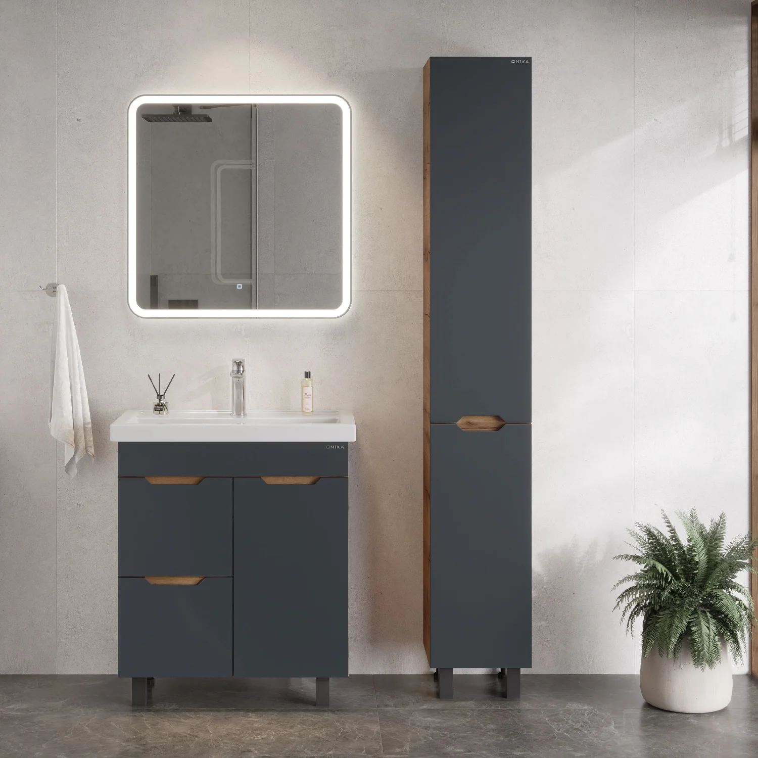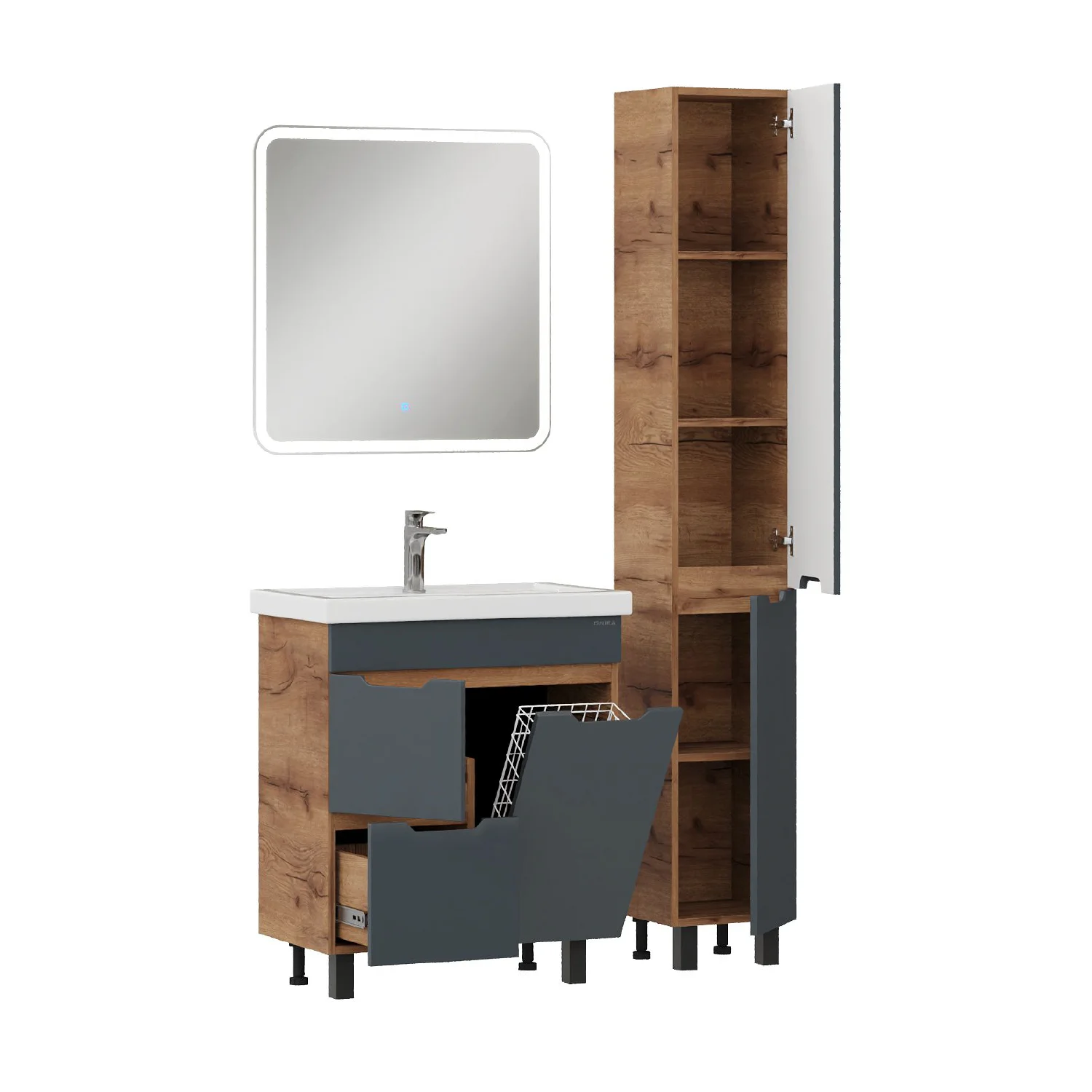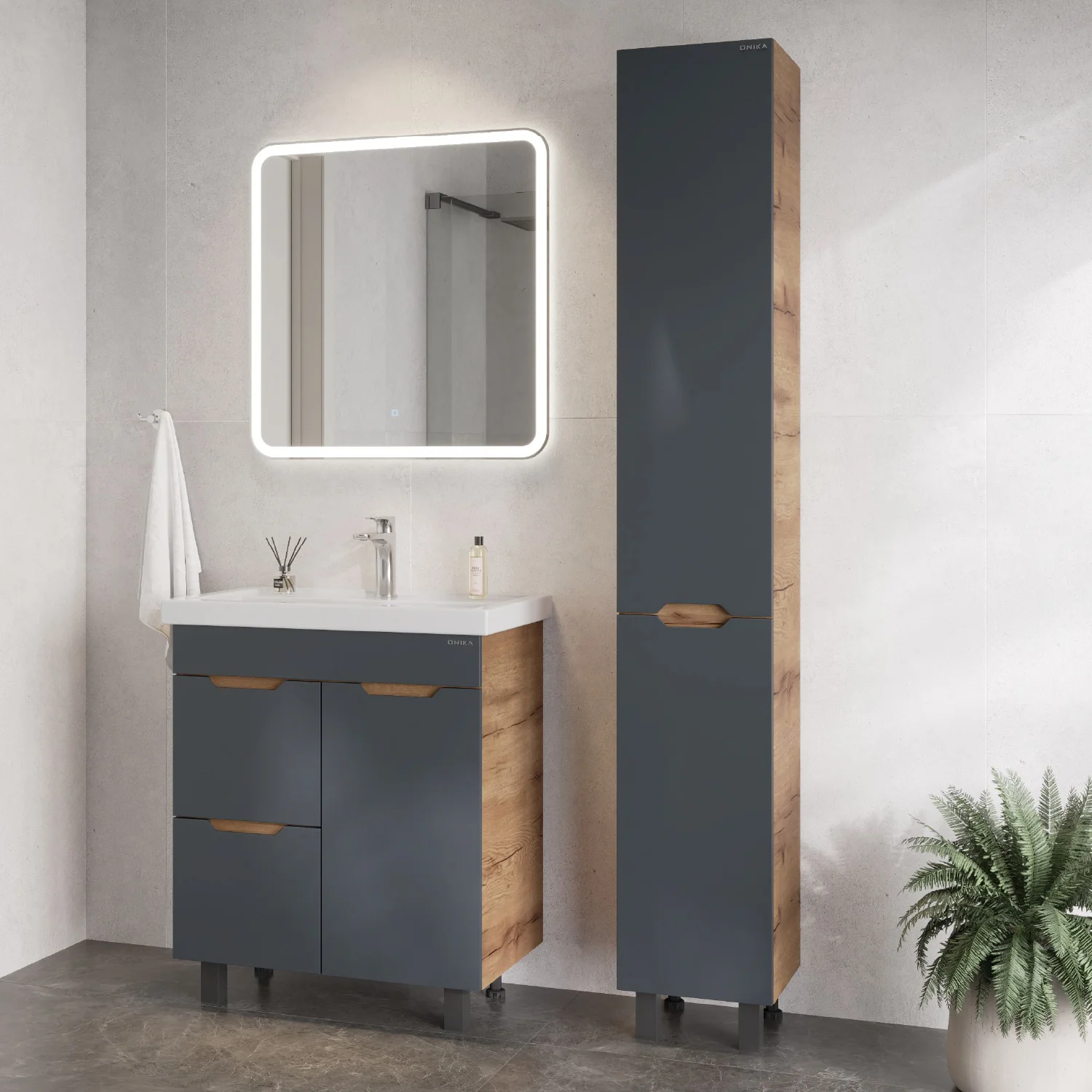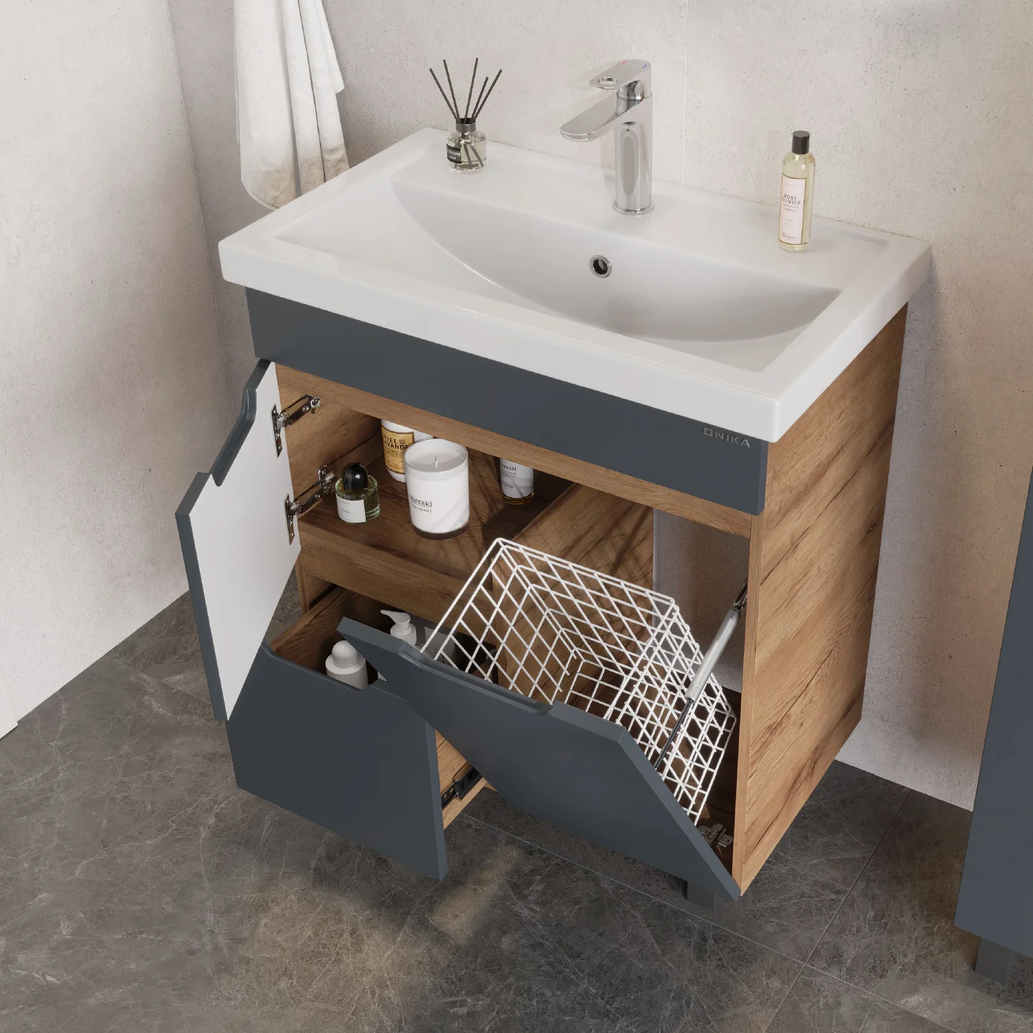 Тумба впишется в любой интерьер благодаря трендовому сочетанию матового графита и золотого дуба, а также поможет эффективно организовать пространство, что особенно важно в небольших ванных комнатах.