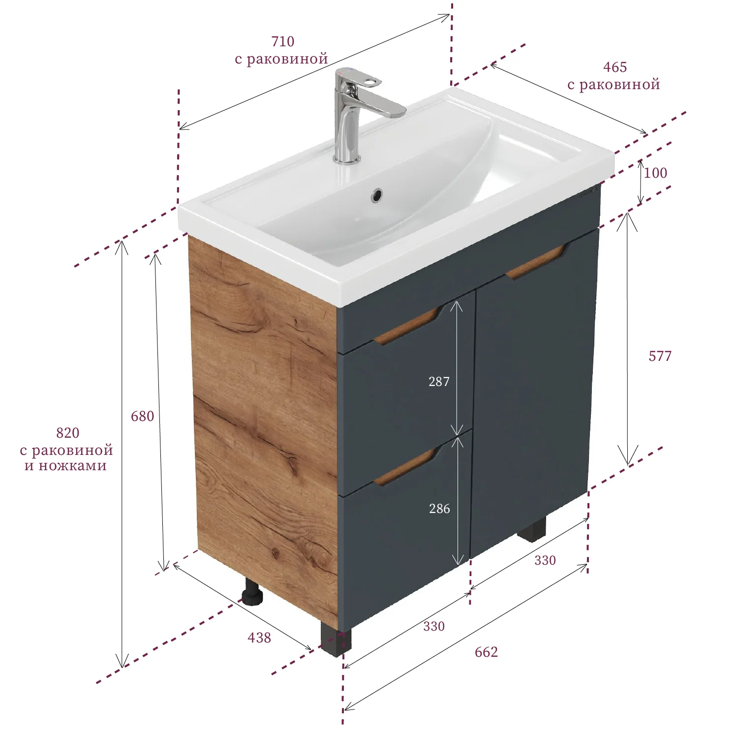 Размеры тумбы без учета раковины и ножек 66х44х68 см.