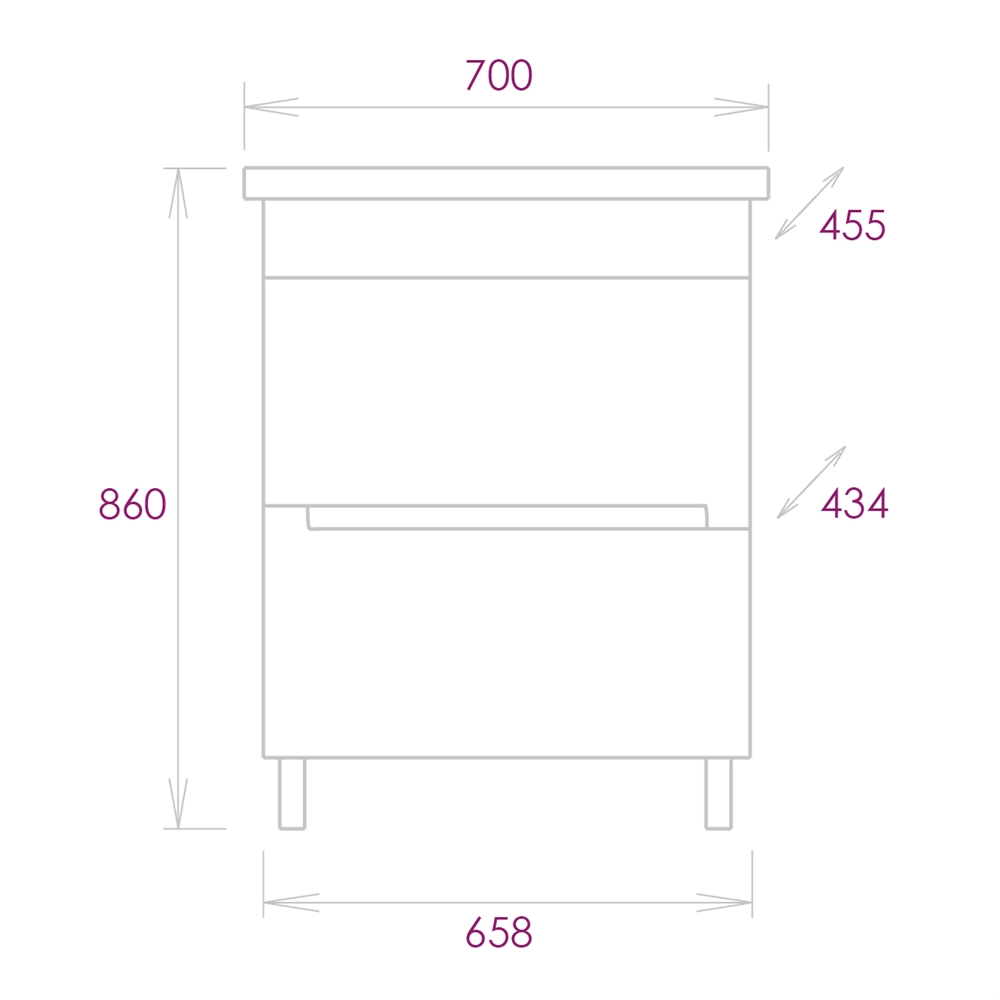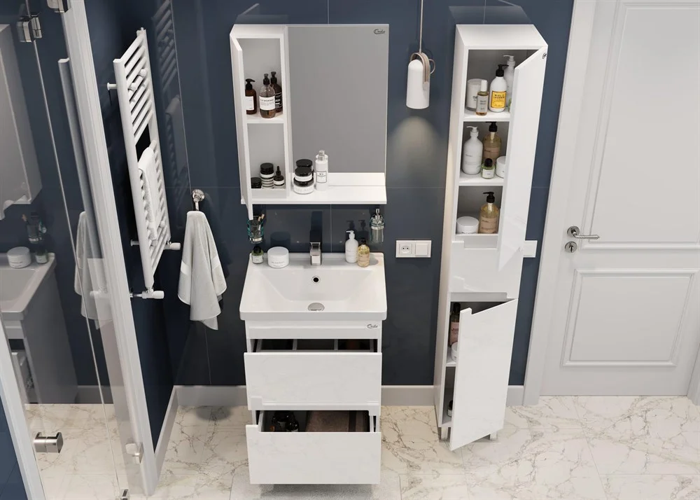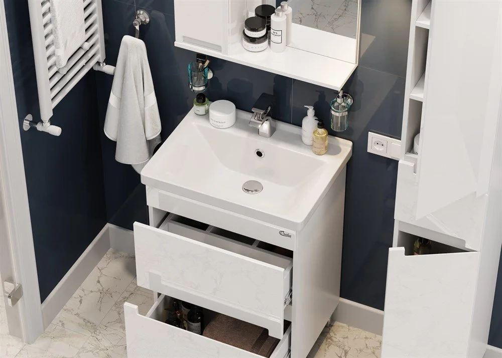 Внутреннее пространство тумбы позволяет компактно разместить бытовые принадлежности: в 2 вместительных ящика с направляющими полного выдвижения поместятся все нобходимые аксессуары.