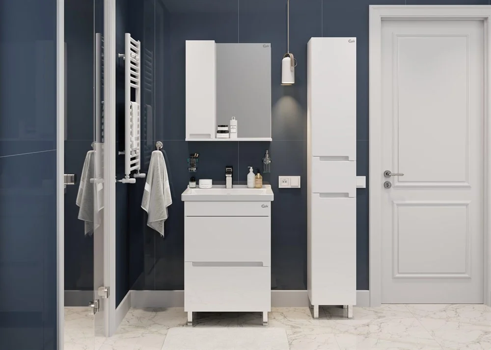 Фасад тумбы выполнен из надежной МДФ и покрыт эмалью, а корпус - из ДСП, так же покрытой эмалью, устойчивой к механическим воздействиям, перепадам температур и высокой влажности.