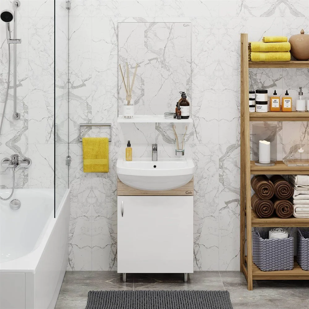 Компактные габариты позволяют грамотно организовать небольшой санузел, а белый глянцевый фасад и корпус цвета дуба с роскошной текстурой гармонично впишется в интерьер любой ванной комнаты.