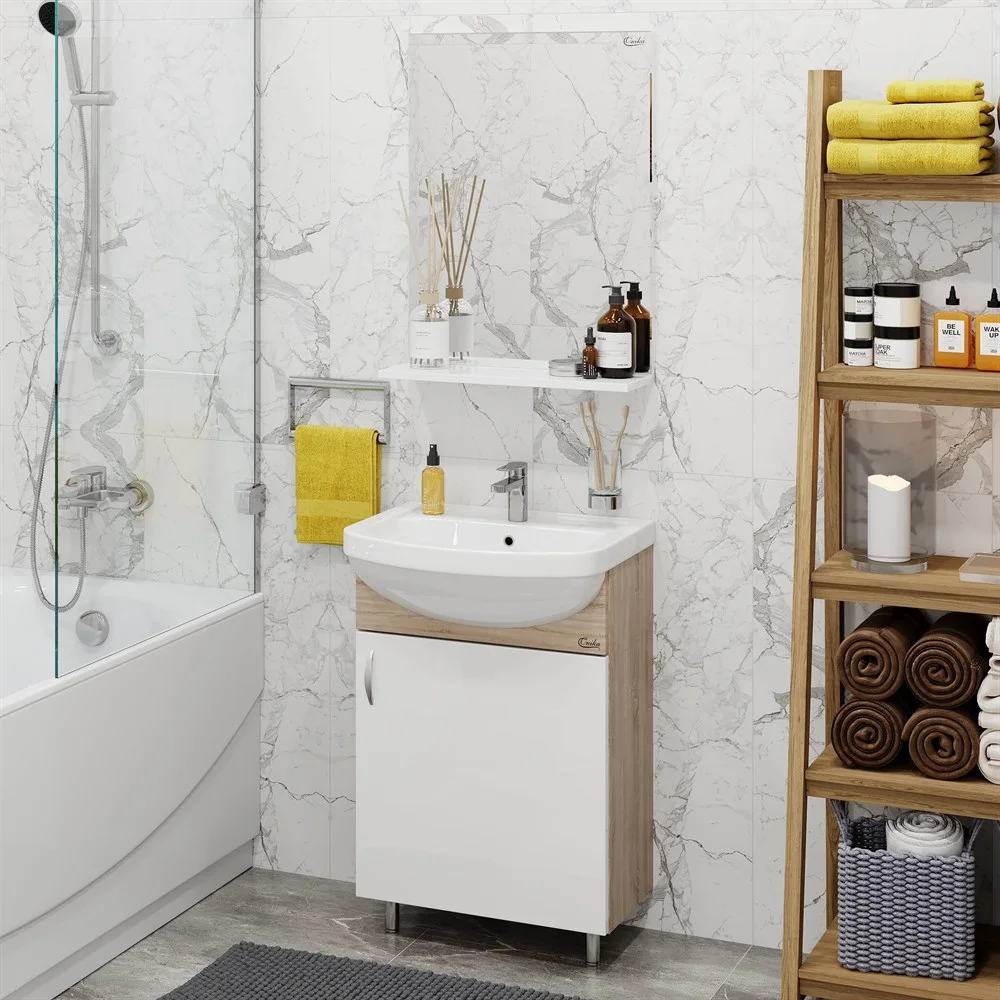 Компактные габариты позволяют грамотно организовать небольшой санузел, а белый глянцевый фасад и корпус цвета дуба с роскошной текстурой гармонично впишется в интерьер любой ванной комнаты.