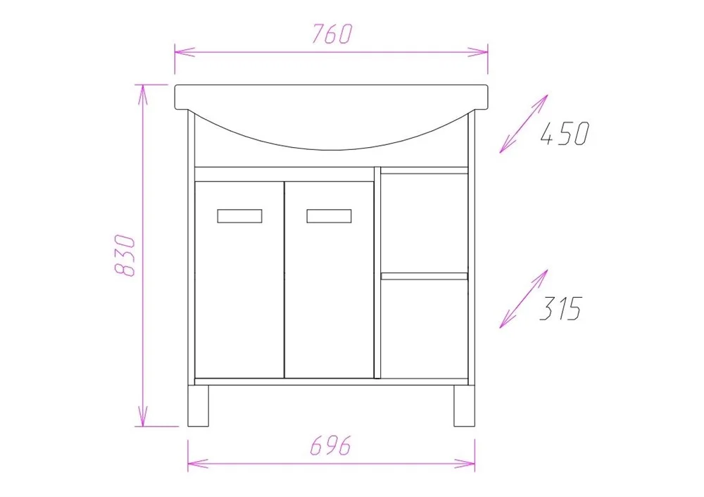 2 открытые полки справа обеспечат быстрый доступ к часто используемым аксессуарам, а пространство за распашными дверцами с системой плавного закрывания и врезными хромированными ручками слева станет удобным местом для хранения различных бытовых принадлежностей.
