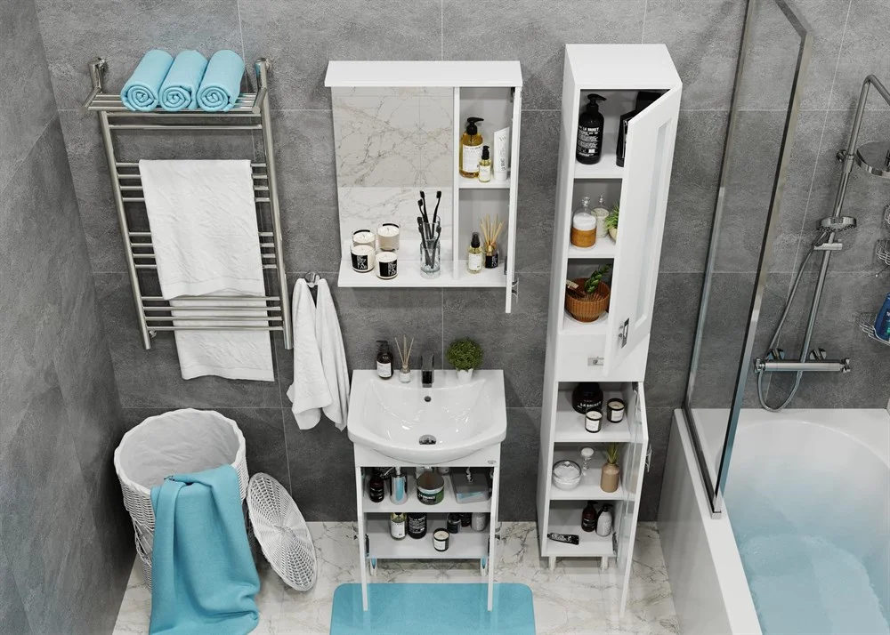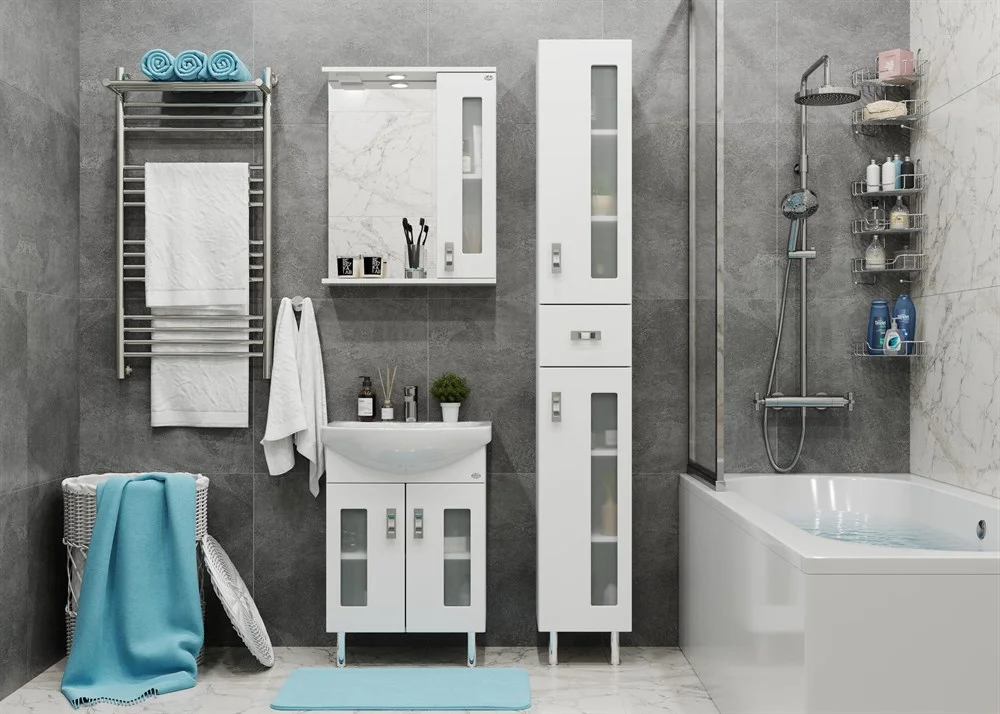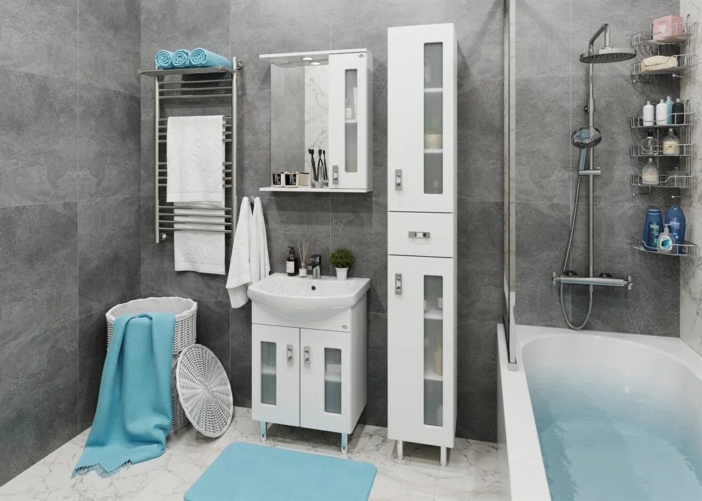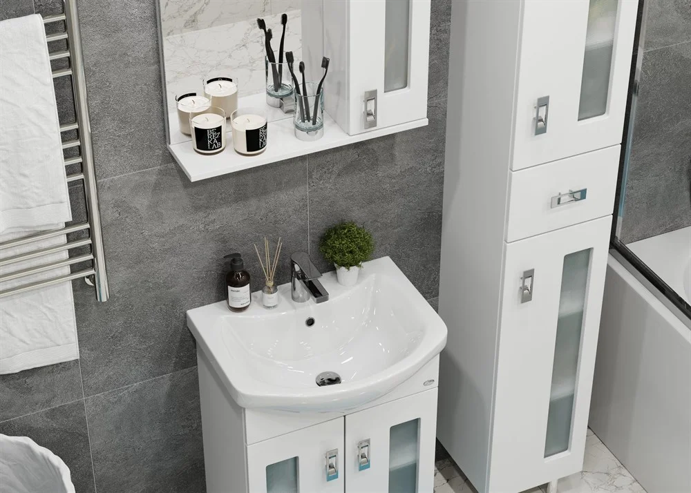 Белоснежный цвет фасада в сочетании с хромированными ручками необычной формы придадут ванной комнате ощущение свежести, чистоты и уюта.