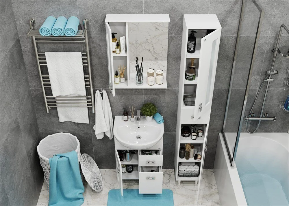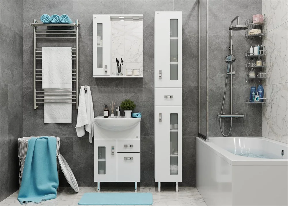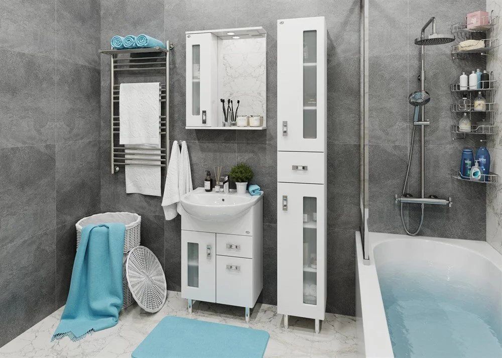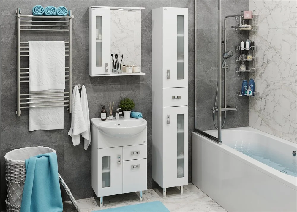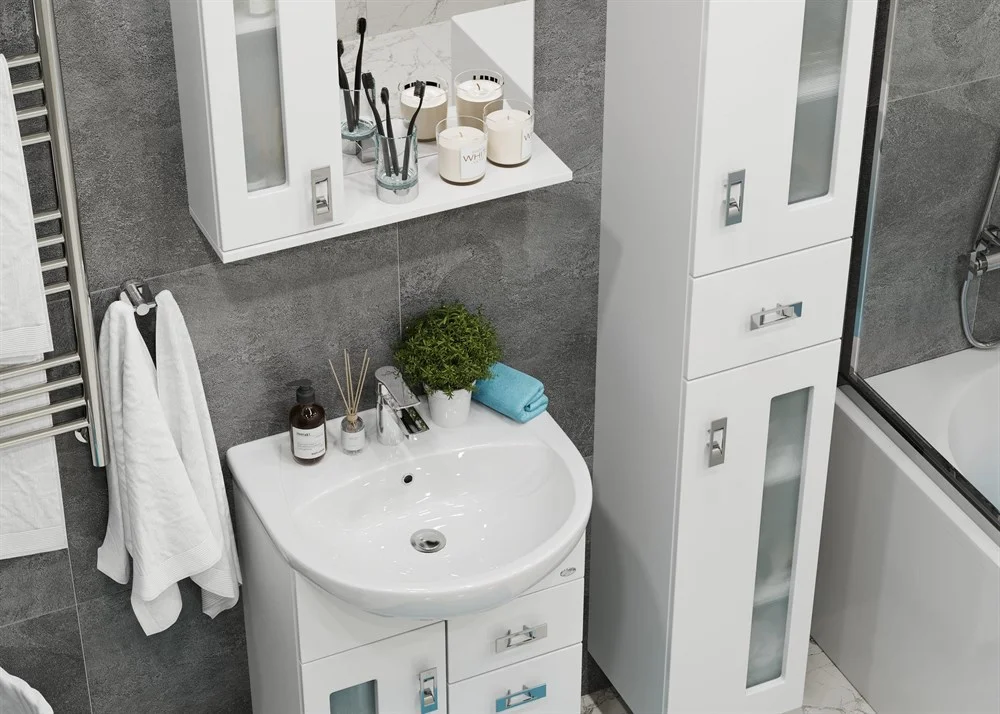 Белоснежный цвет фасада в сочетании с хромированными ручками необычной формы придадут ванной комнате ощущение свежести, чистоты и уюта.