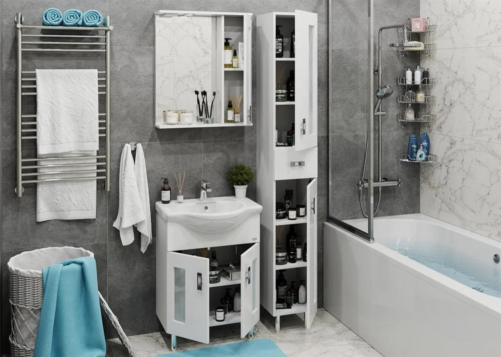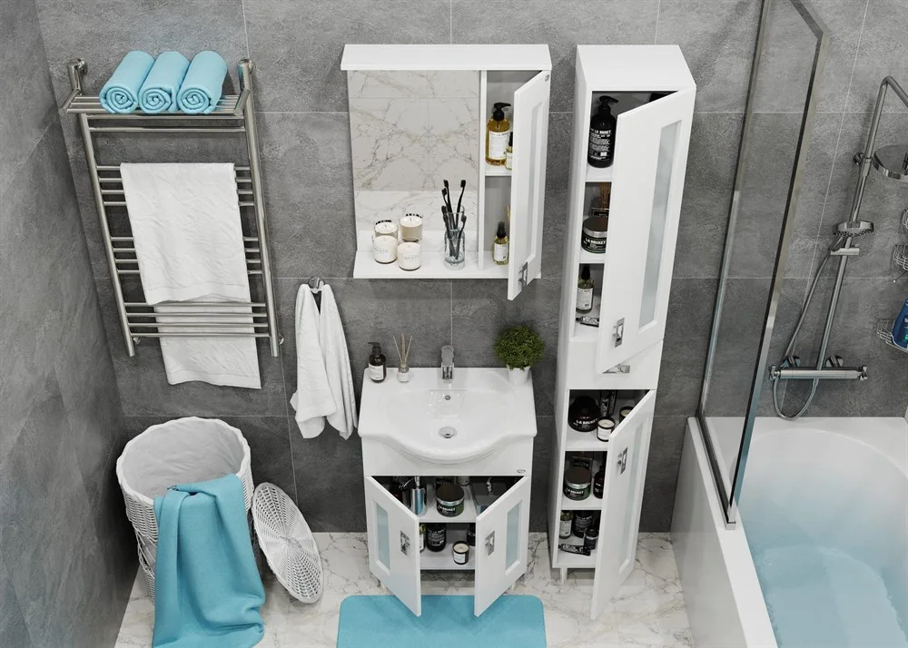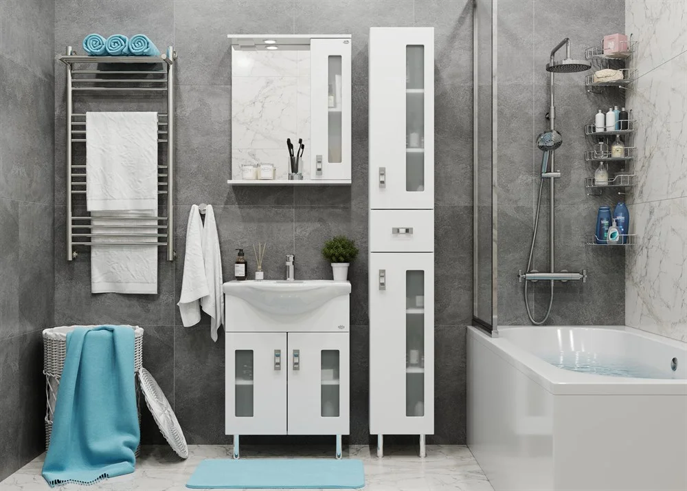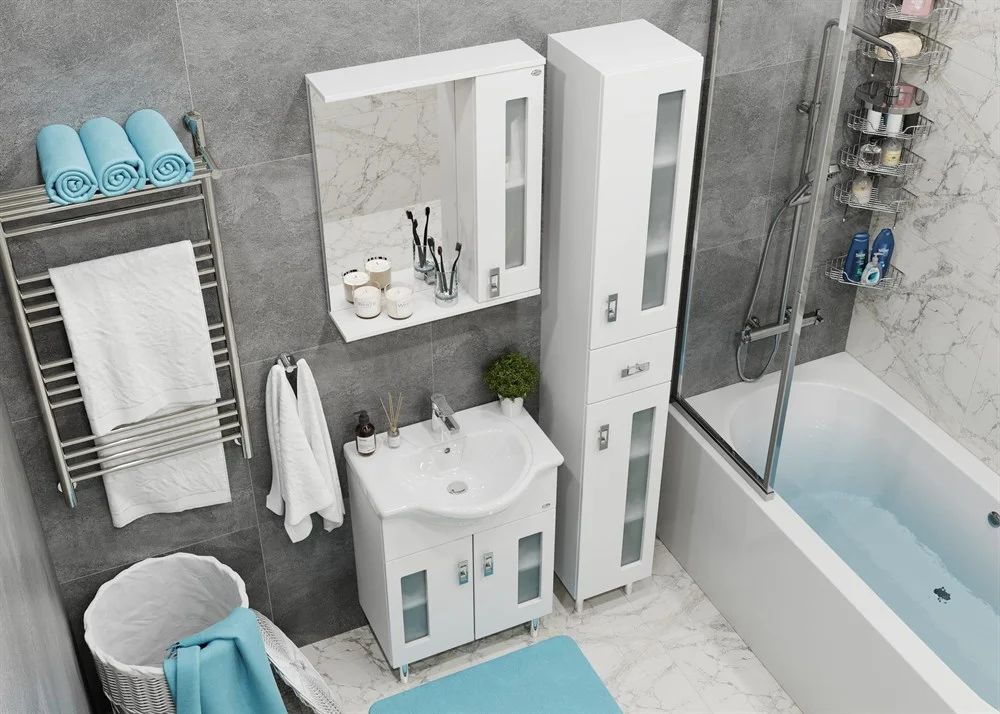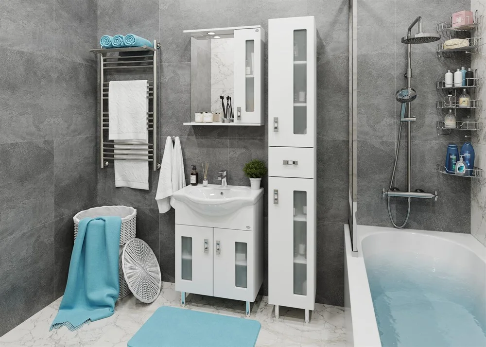 Белоснежный цвет фасада в сочетании со вставками из матового стекла и хромированными ручками необычной формы придадут ванной комнате ощущение свежести, чистоты и уюта.