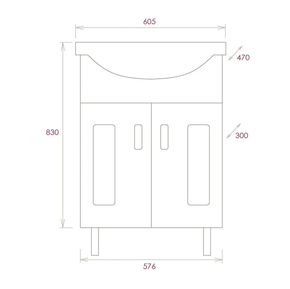 За распашными дверцами, снабженными системой плавного закрывания и украшенными хромированными ручками, скрывается просторное внутреннее пространство, разделенное горизонтальной полкой: оно служит для размещения необходимых бытовых принадлежностей.