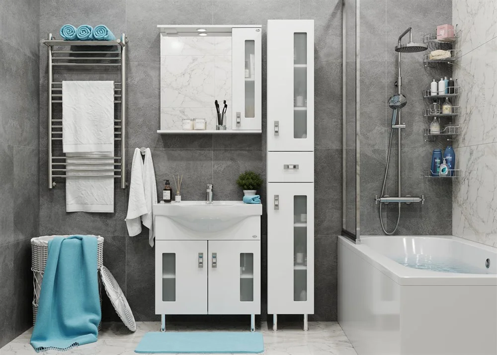 Белоснежный цвет фасада в сочетании со вставками из матового стекла и хромированными ручками необычной формы придадут ванной комнате ощущение свежести, чистоты и уюта.