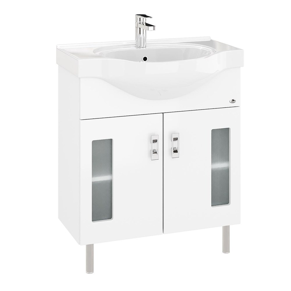 Белоснежный цвет фасада в сочетании со вставками из матового стекла и хромированными ручками необычной формы придадут ванной комнате ощущение свежести, чистоты и уюта.