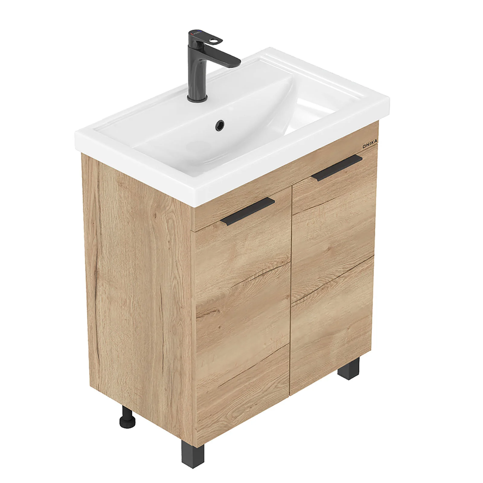 Напольная тумба для ванной комнаты Onika Легран 70 - это сочетание насыщенного древесного декора и благородства металла: роскошная текстура и натуральный цвет дуба дают теплоту, а черная матовая фурнитура добавляют урбанизма и солидности.