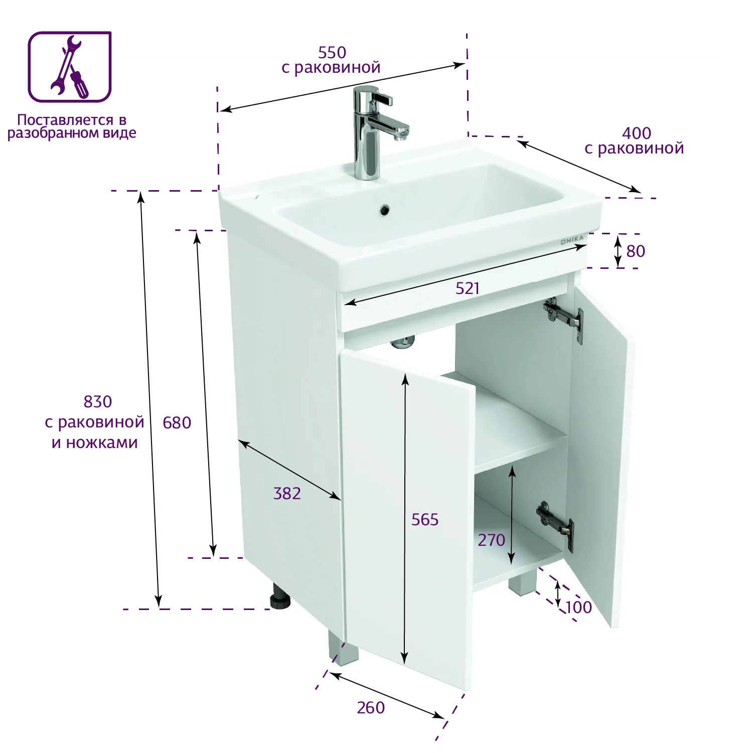 Размеры тумбы без учета раковины и ножек 52x38x68 см.