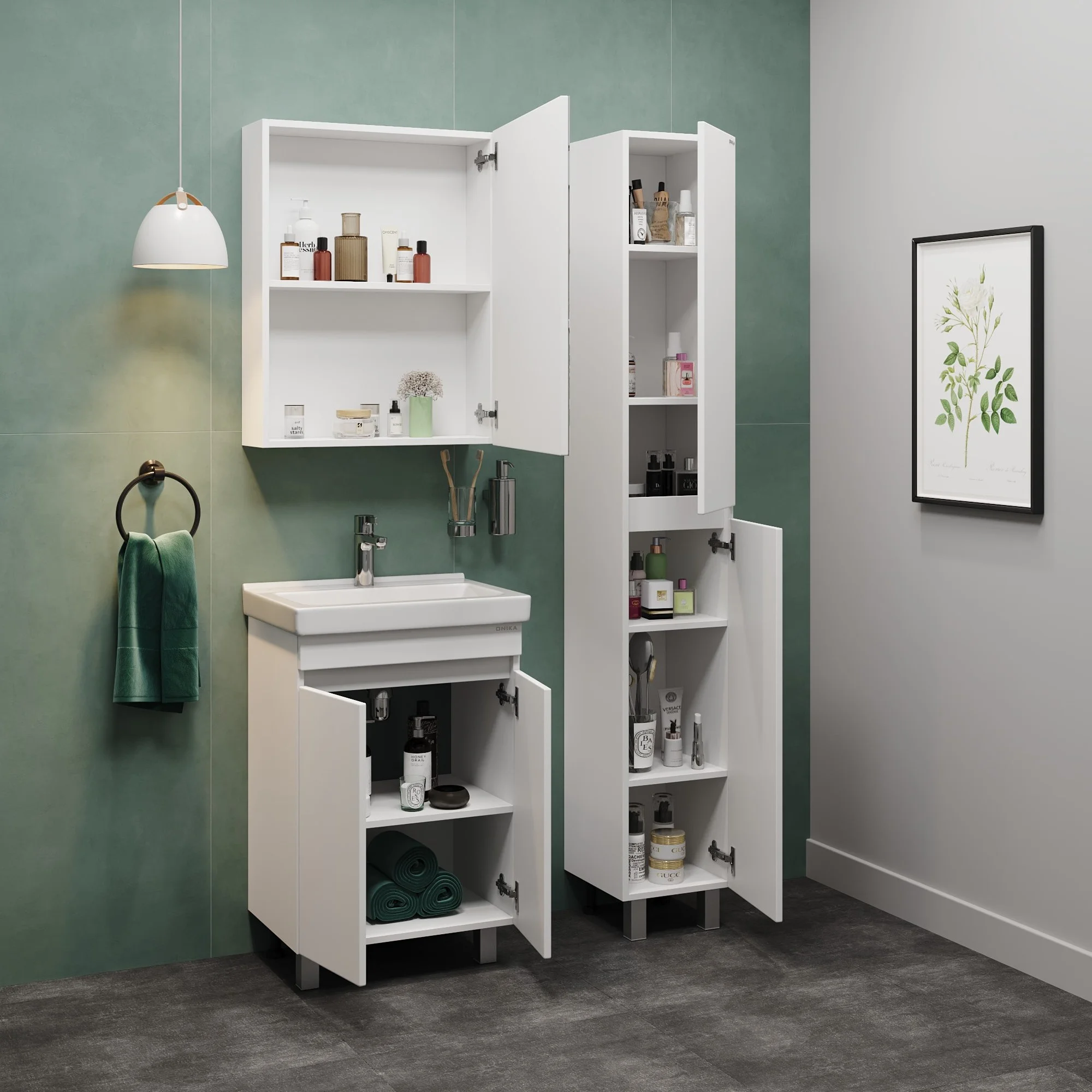 Тумба имеет белый глянцевый фасад и строгие формы без декора. За дверцами с интегрироваными ручками скрывается пространство с полкой для размещения необходимых бытовых принадлежностей.