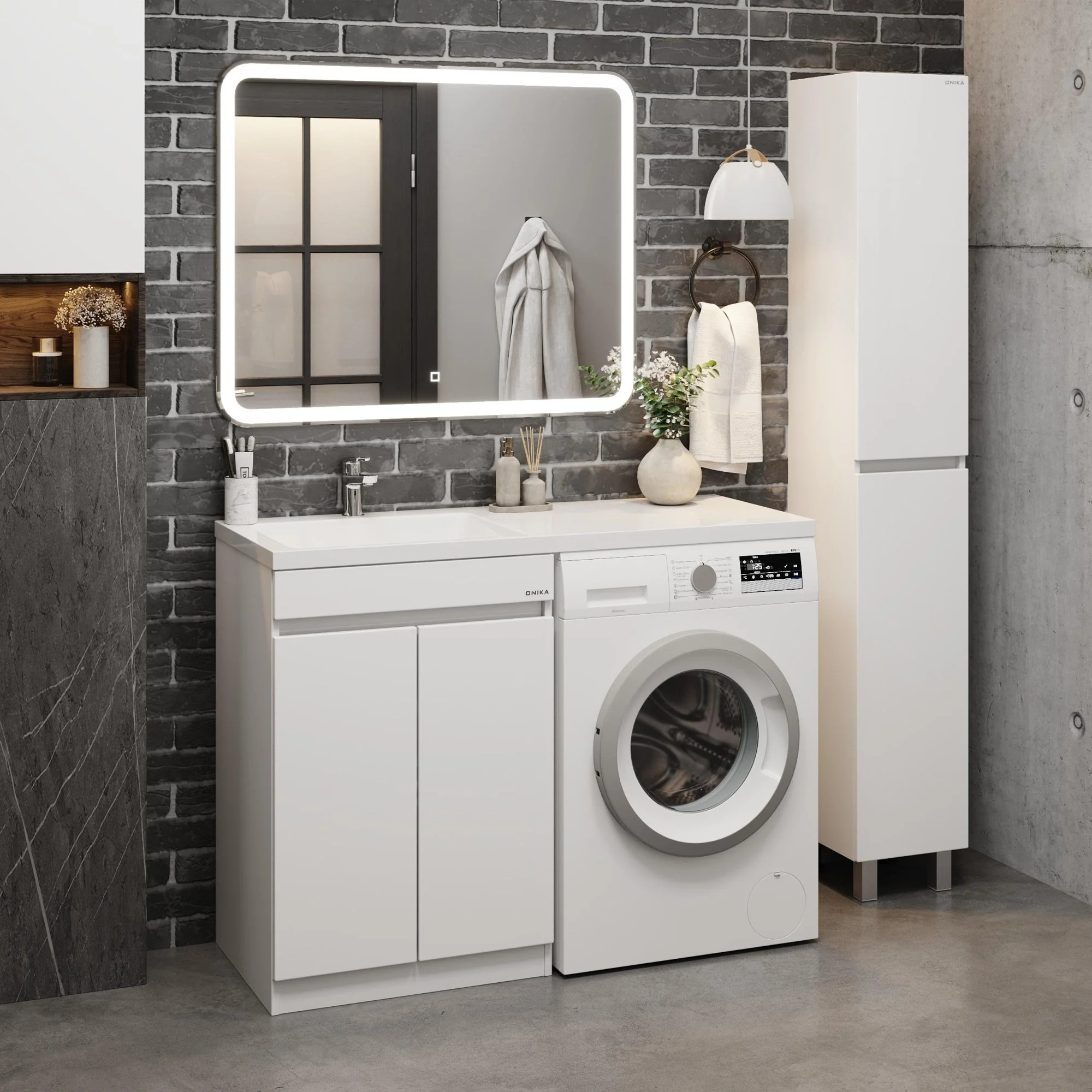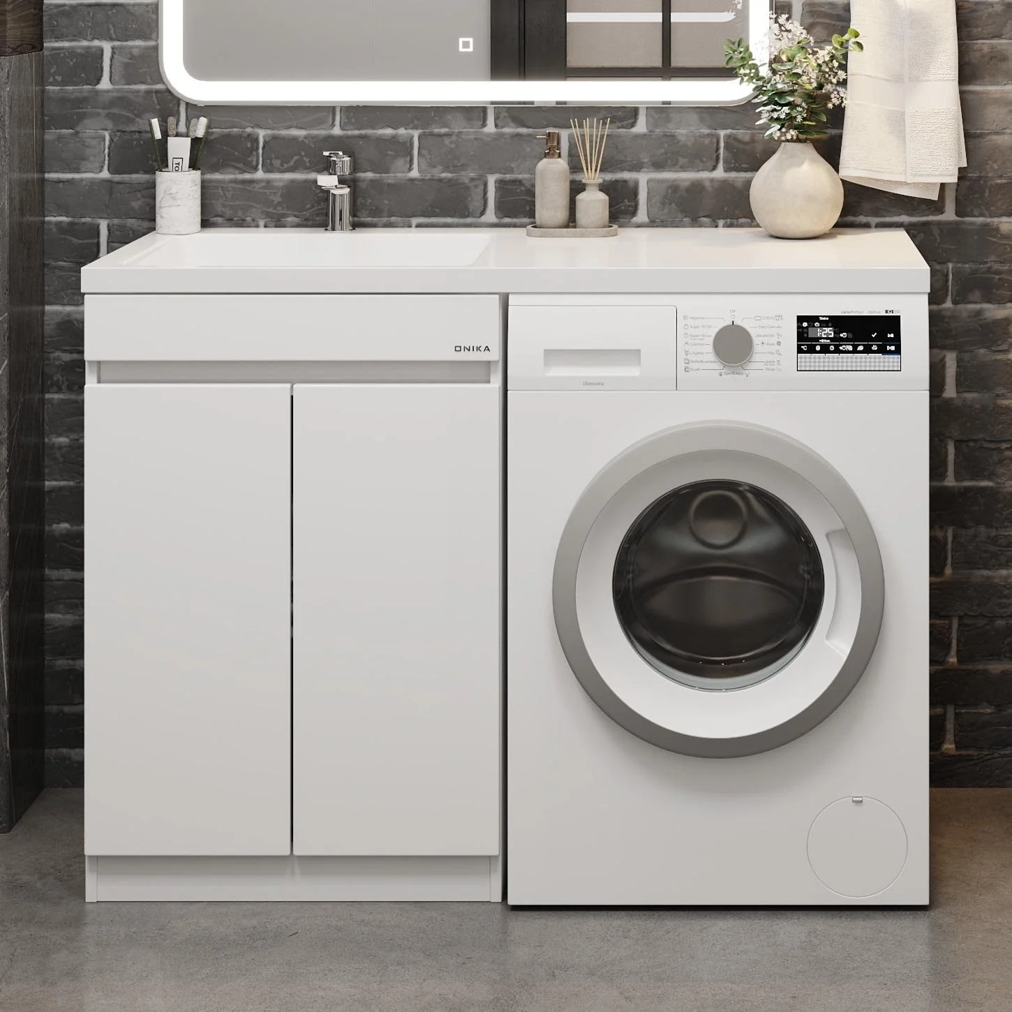 Напольная тумба Onika Милтон Нова 58 станет отличным решением для совмещения со стиральной машиной.
