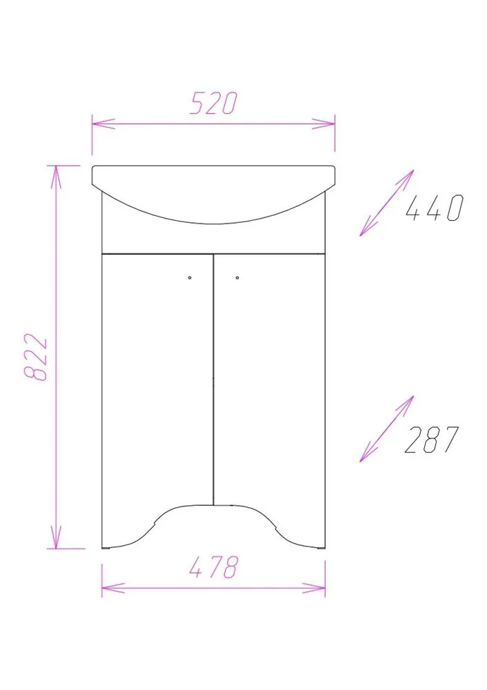 Яркие акценты тумбы - белоснежный фигурный фасад с оригинальной отделкой снизу и круглые хромированные ручки на распашных дверцах.