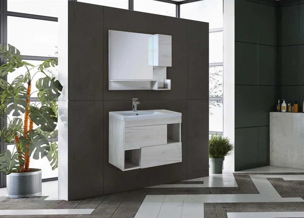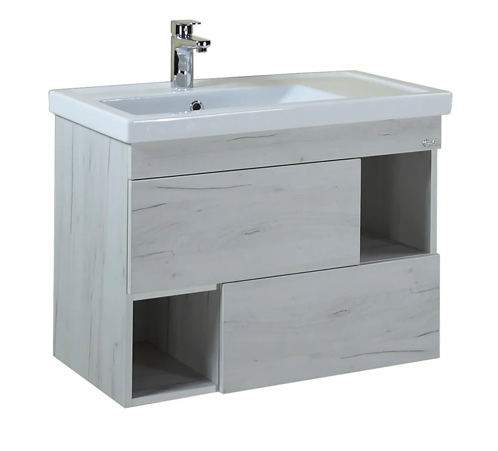 подвесной тумба Onika САНТОРИНИ 80.13 отражает актуальные тенденции в дизайне мебели для ванной комнаты: минимализм и геометрия фасадов, чёткость и лаконичность форм, отсутствие декора и стильный цвет белой древесины с текстурой дорогих пород.