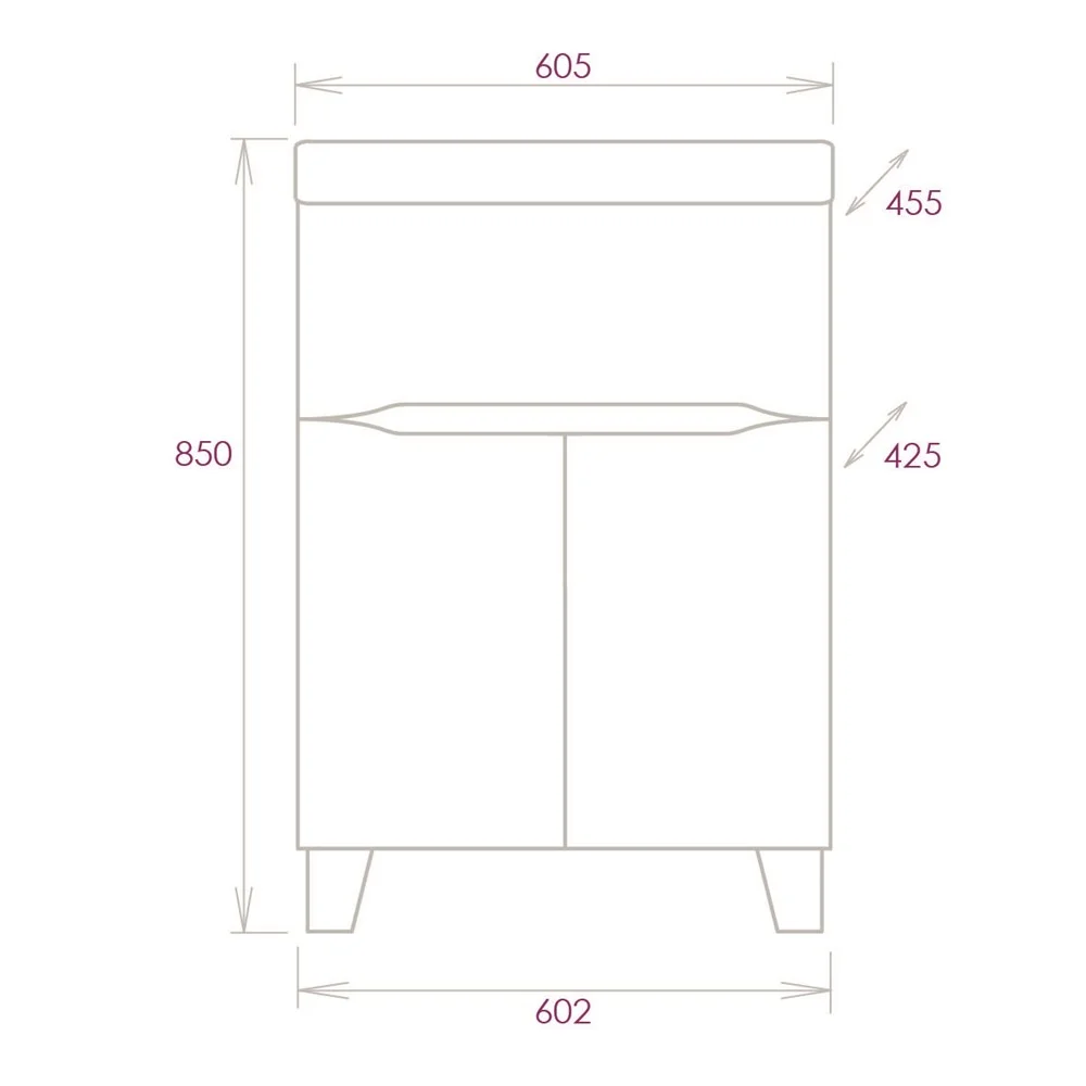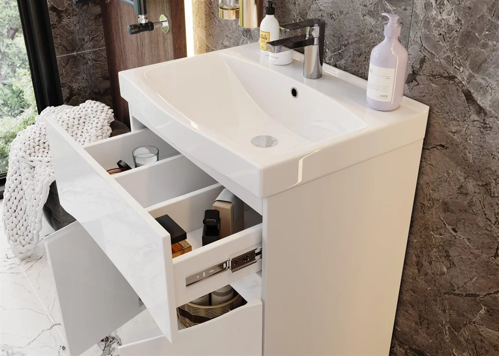 Ящик тумбы сконструирован с разделением внутреннего и подсифонного пространства и оснащен направляющими полного выдвижения, а дверцы снабжены системой плавного закрывания.