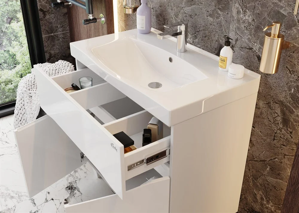 Ящик тумбы сконструирован с разделением внутреннего и подсифонного пространства и оснащен направляющими полного выдвижения, а дверцы снабжены системой плавного закрывания.