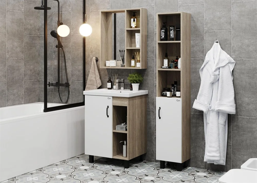 В тумбе Onika ТИМБЕР 60.01 удачно сочетаются контрастные цвета и фактуры: белый матовый фасад с покрытием SoftTouch, корпус цвета дуба с роскошной текстурой, черная матовая металлическая фурнитура.