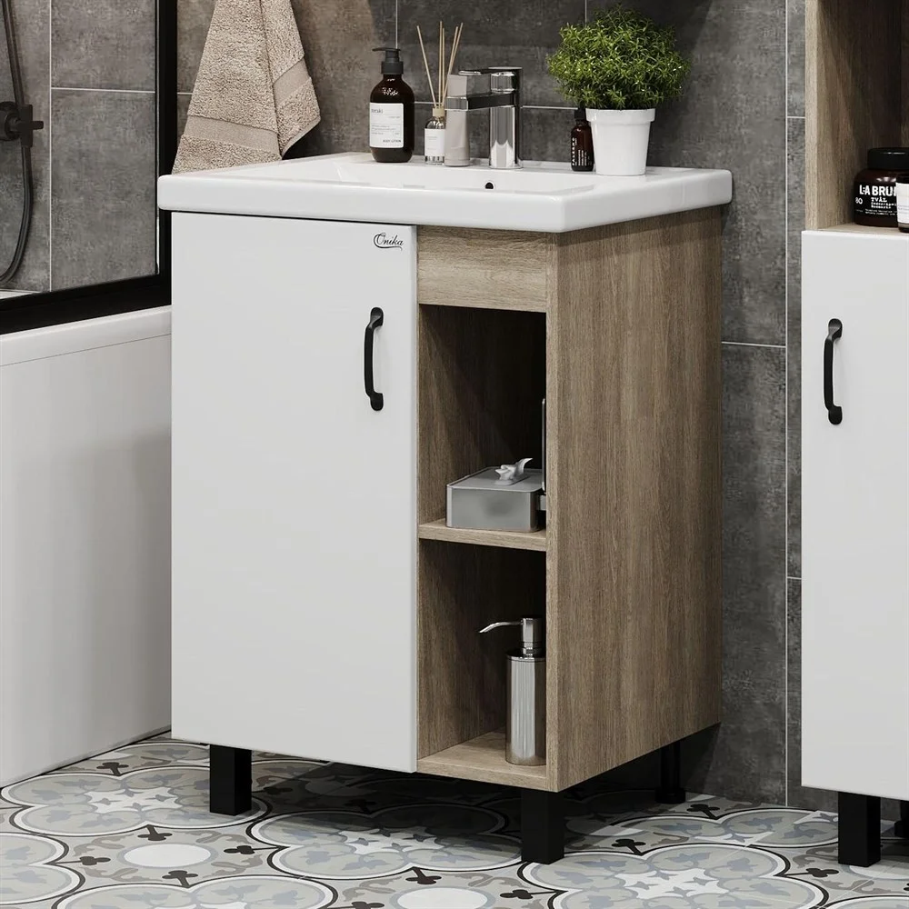 В тумбе Onika ТИМБЕР 60.01 удачно сочетаются контрастные цвета и фактуры: белый матовый фасад с покрытием SoftTouch, корпус цвета дуба с роскошной текстурой, черная матовая металлическая фурнитура.