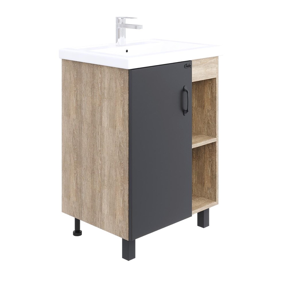 В тумбе Onika ТИМБЕР 60.01 удачно сочетаются контрастные цвета и фактуры: серый матовый фасад с покрытием SoftTouch, корпус цвета дуба с роскошной текстурой, черная матовая металлическая фурнитура.